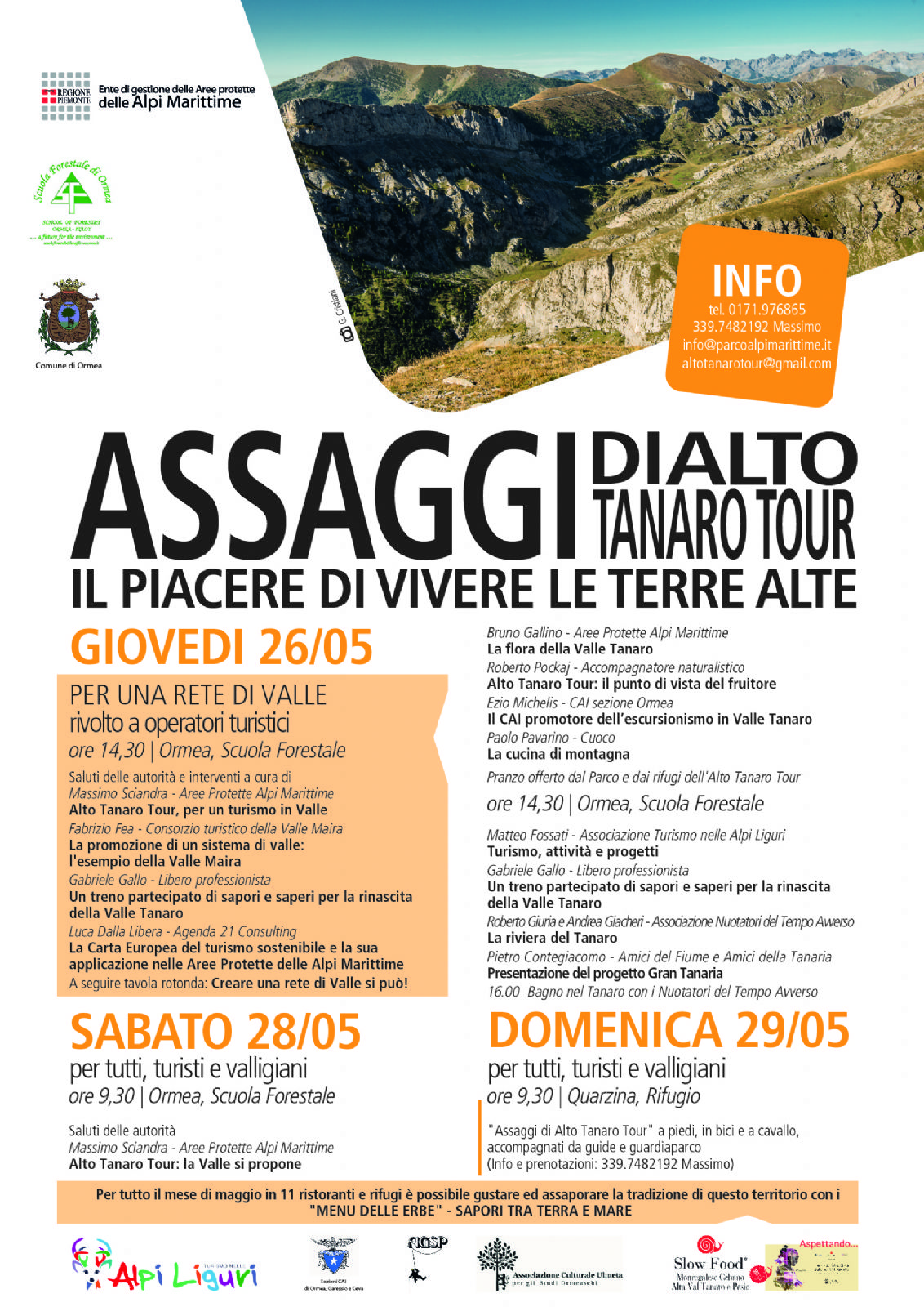 L'Alto Tanaro Tour si presenta! 9 tappe, 135 km tra splendidi ambienti e panorami incantevoli per percorrere l'Alta Val Tanaro. Sabato 28 maggio un convegno per valorizzare la valle, scoprire insieme come sia possibile un turismo slow e, domenica 29, provare un assaggio del percorso a piedi, in bici o a cavallo. Per info: altotanarotour@gmail.com