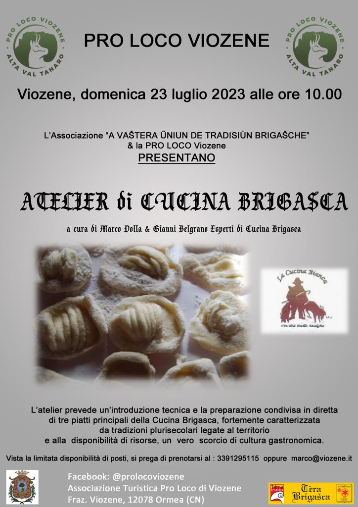 L'Associazione "A Vastera uniun de tradisiun brigasche" & la Pro loco di Viozene presentano un Atelier di Cucina Brigasca. A cura di Marco Dolla e Gianni Belgrano, esperti di cucina brigasca. L'atelier prevede un'introduzione tecnica e la preparazione condivisa in diretta di tre piatti principali della Cucina Brigasca, fortemente caratterizzata da tradizioni plurisecolari legate al territorio e alla disponibilità di risorse, un vero scorcio di cultura gastronomica.