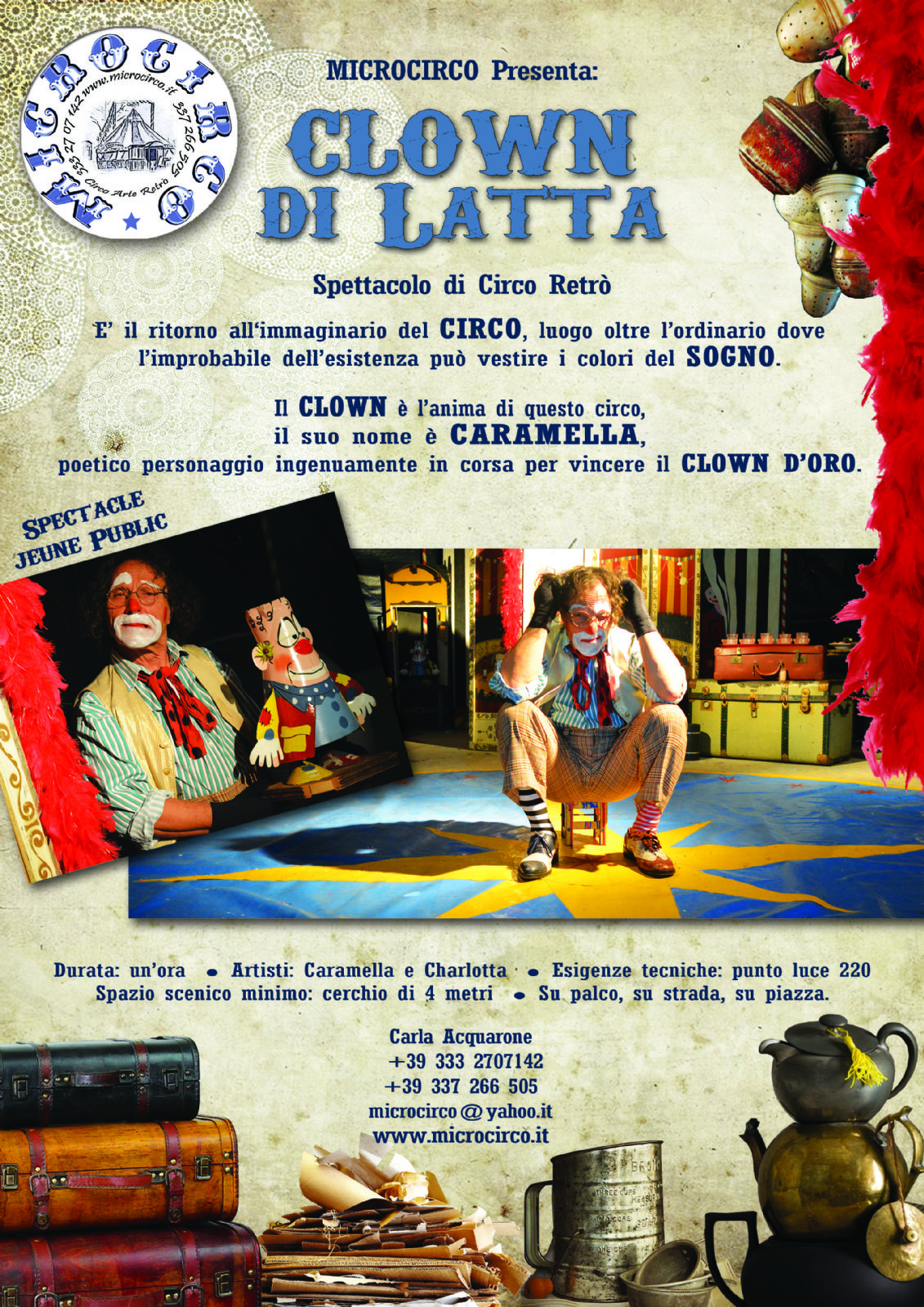 Spettacolo di circo retrò - E' il ritorno all'immaginario del circo, luogo oltre l'ordinario dove l'improbabile dell'esistenza può vestire i colori del sogno. Il clown è l'anima di questo circo, il suo nome è Caramella, poetico personaggio ingenuamente in corsa per vincere il clown d'oro.