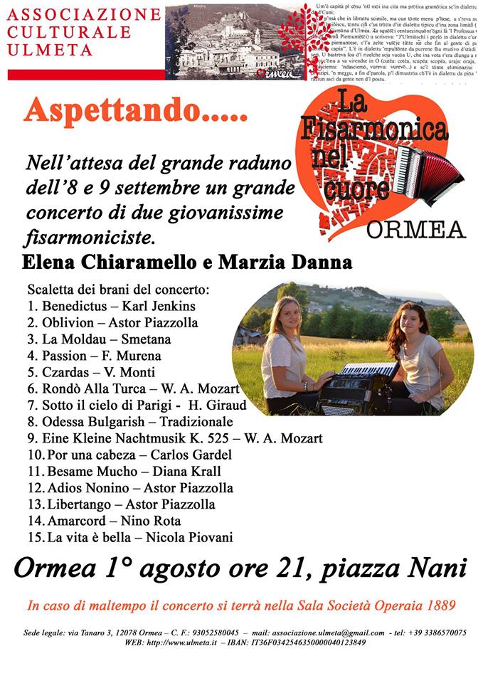 Elena Chiaramello e Marzia Danna sono due fisarmoniciste della provincia di Cuneo, allieve dell’insegnante Davide Borra presso le scuole di musica “Fondazione Fossano Musica” e “Scuola comunale di Mondovì”. Fin da piccole si sono avvicinate alla musica. Marzia Danna, da più di 5 anni pianista e organista, ha deciso lo scorso anno di intraprendere lo studio della fisarmonica, riscuotendo ottimi risultati. Elena Chiaramello, da 5 anni fisarmonicista, ha affiancato invece da 2 anni lo studio del pianoforte. Vincitrice di numerosi Concorsi Internazionali di fisarmonica ed ora impegnata in attività concertistica. Le due giovanissime, nella loro breve ma attiva carriera, hanno tenuto numerosi concerti durante il Monferrato Classic Festival, sono state protagoniste di un concerto in collaborazione con il rinomato fisarmonicista Pietro Roffi presso il Teatro di Città della Pieve in Umbria e numerosi concerti serali nelle chiese della provincia.