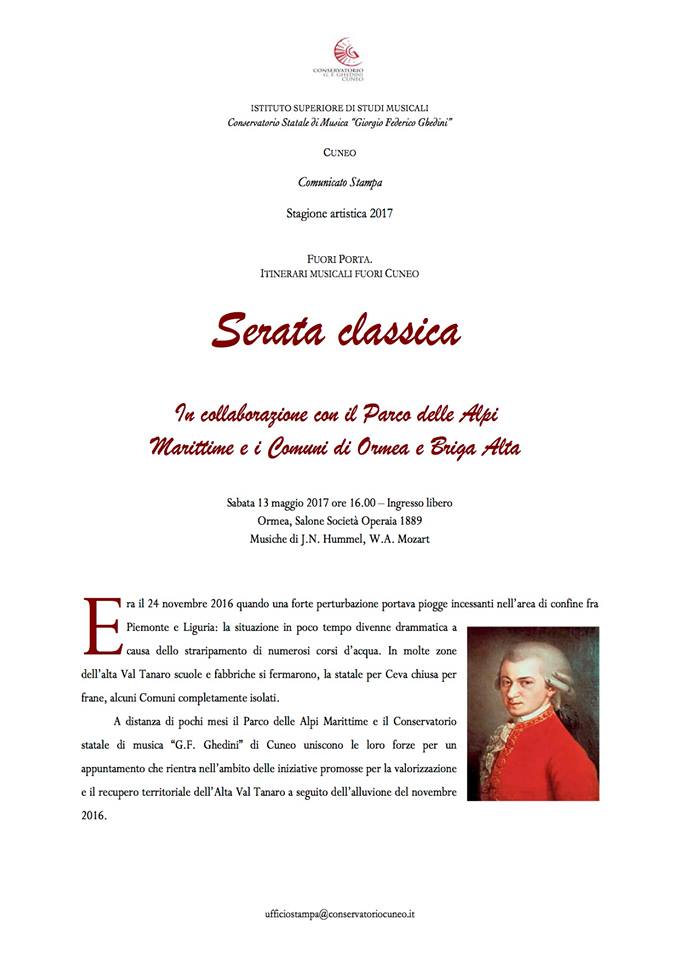 Sarà la musica, sabato 13 maggio 2017 alle ore 16.00 a portare un messaggio di incoraggiamento per il dopo alluvione e lo farà con l’impegno di alcuni dei più brillanti talenti del Conservatorio cuneese. Marta Conte, Umberto Beccaria, Fiammetta Rossaro (pianoforte), Caterina Alifredi (violino) e Saverio Giri (flauto) si alterneranno sul palco del Salone della Società Operaia 1889 di Ormea in un concerto realizzato con la collaborazione dei Comuni di Ormea e di Briga Alta, sotto l’egida e il coordinamento del Parco Alpi Marittime.