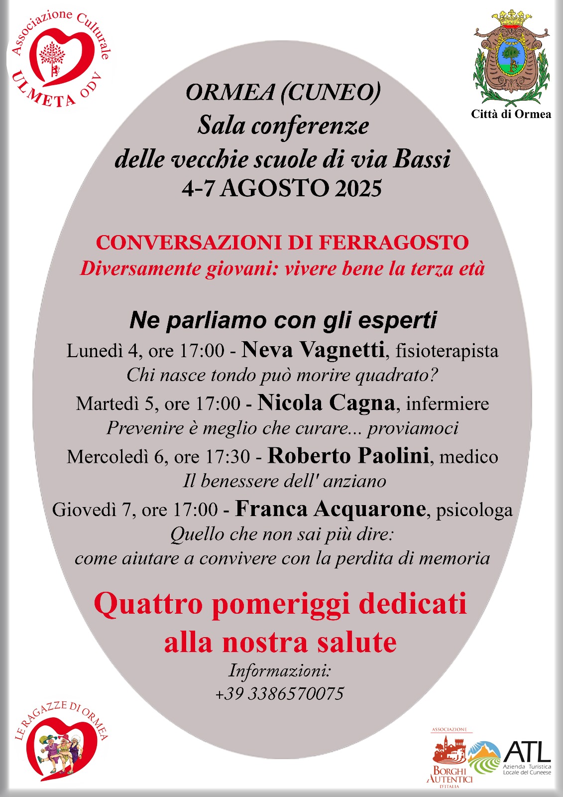 Dal 4 al 7 agosto nella Sala conferenze delle vecchie scuole di via Bassi, "Conversazioni di ferragosto - Diversamente giovani: vivere bene la terza età", quattro pomeriggi dedicati alla salute