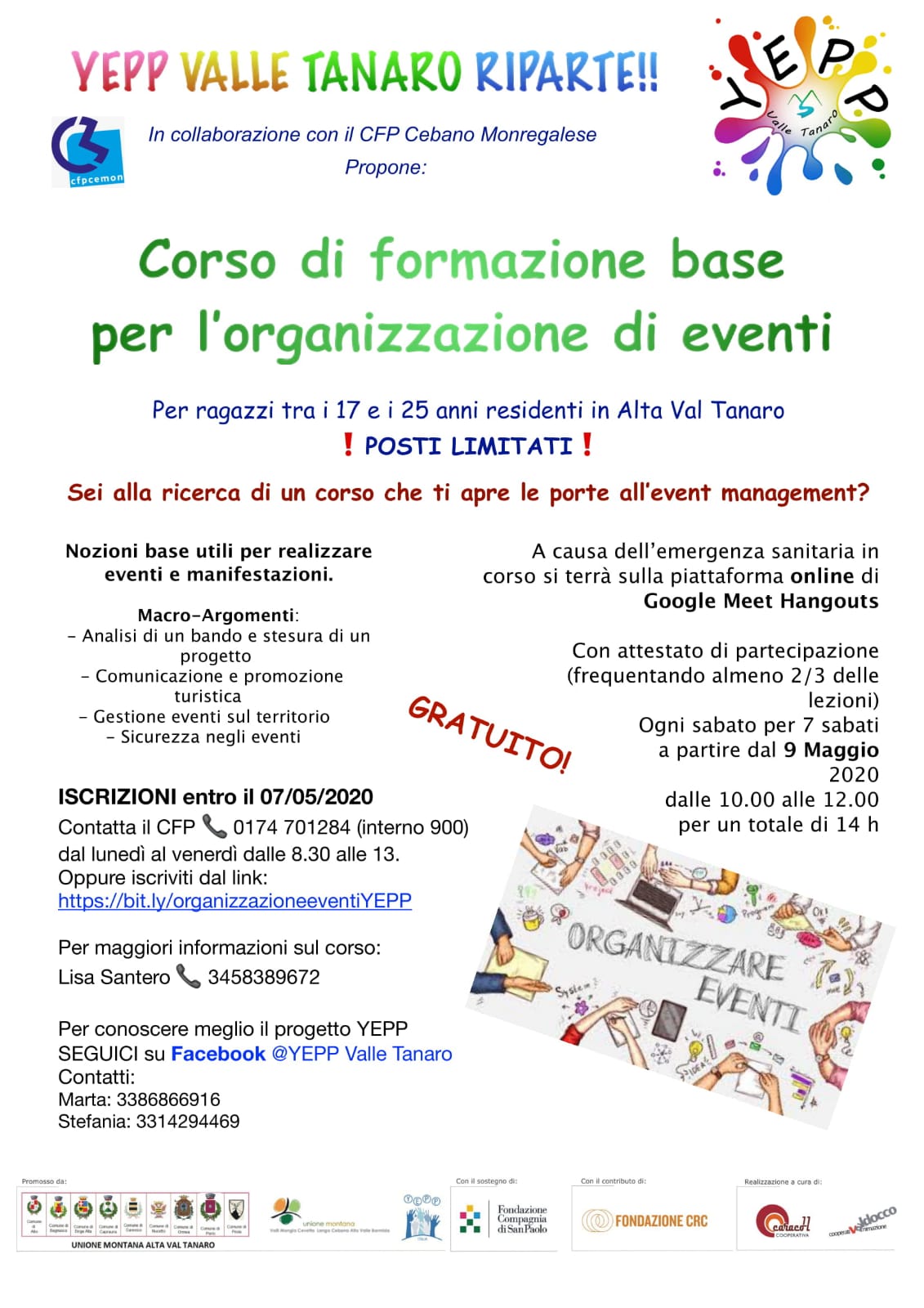 Corso gratuito rivolto a giovani residenti in Alta Val Tanaro, di età compresa tra i 17 e i 25 anni, volto a sviluppare le competenze organizzative e gestionali legate agli eventi del territori.