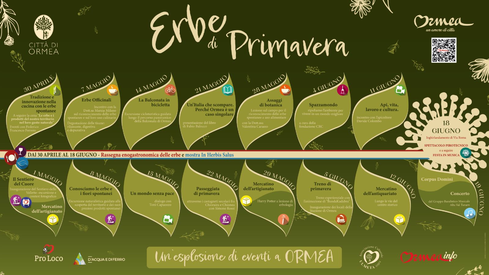Sabato 30 aprile inizia la grande rassegna enogastronomica “Erbe di Primavera”: per otto weekend, ogni sabato e domenica si potranno assaporare aperitivi, cene, digestivi e prodotti a base di erbette spontanee presso i bar, i ristoranti e i rifugi di Ormea che aderiranno alla manifestazione. L'evento durerà per quasi due mesi, con il gran finale di sabato 18 giugno, giorno precedente il Corpus Domini, contraddistinto dall’attesissimo ritorno del tradizionale appuntamento con l’inghirlandamento della via principale del borgo e lo spettacolo pirotecnico in serata.