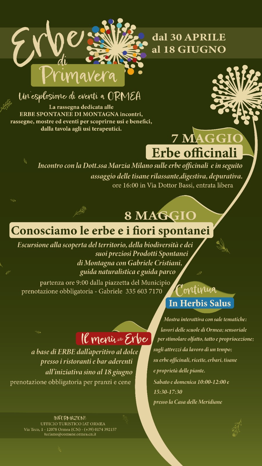 Fino al 18 giugno sarà visitabile la mostra "In Herbis Salus" con lostesso orario di apertura dell'ufficio turistico, nei Ristoranti aderenti potrete gustare i Menu delle Erbe mentre i Bar di Ormea vi aspettano con aperitivi, tisane e digestivi a 'tema'.