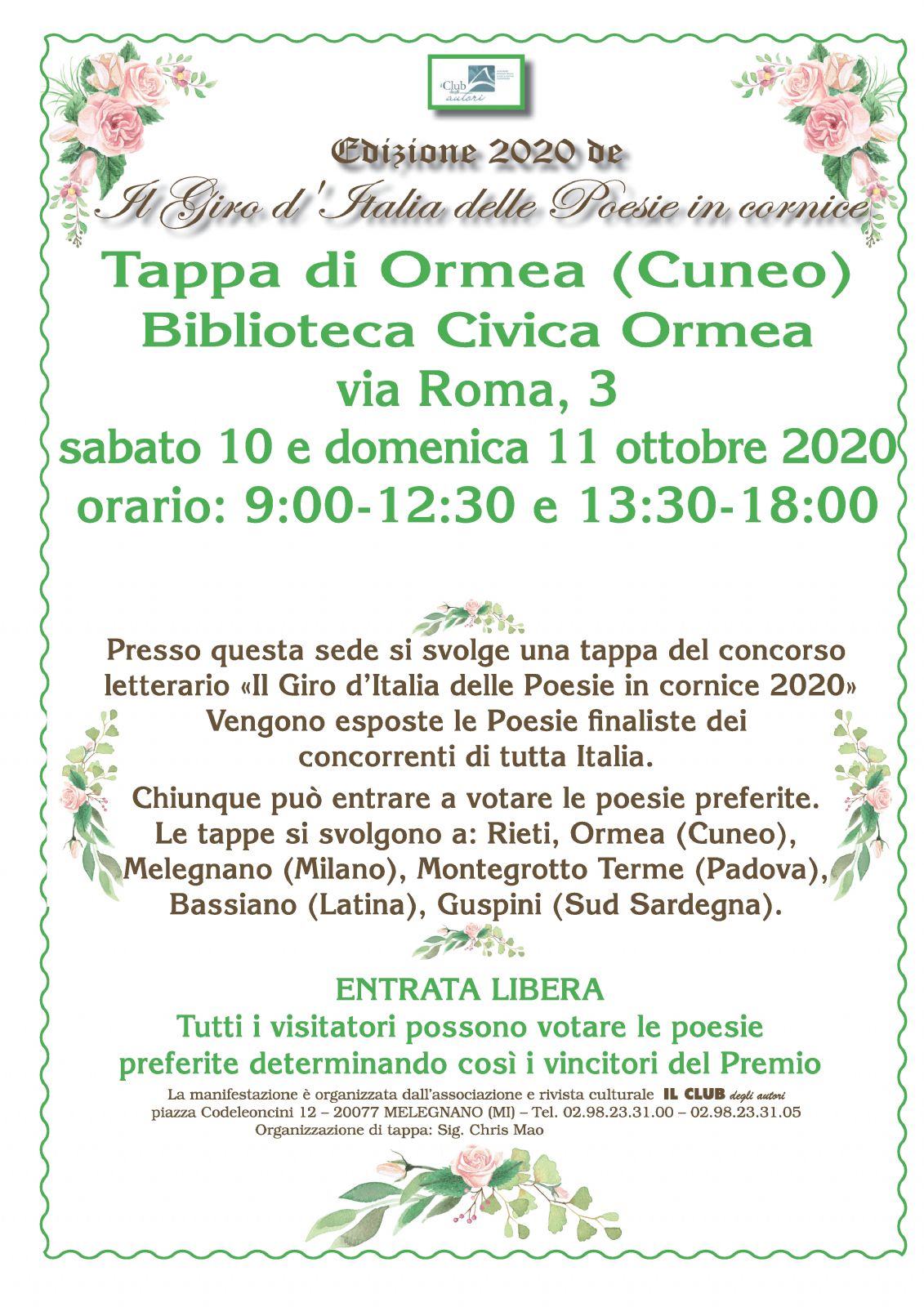 Presso questa sede si svolge una tappa del concorso letterario «Il Giro d’Italia delle Poesie in cornice 2020» Vengono esposte le Poesie finaliste dei concorrenti di tutta Italia.