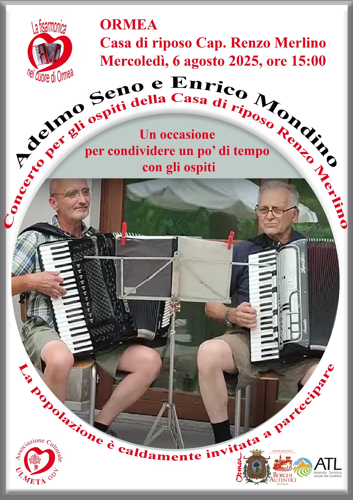 Mercoledì 6 agosto 2025 alle ore 15:00, alla Casa di riposo Cap. Renzo Merlino di Ormea, si terrà un concerto con Adelmo Seno ed Enrico Mondino, fisarmonicisti della rassegna La fisarmonica nel cuore di Ormea.