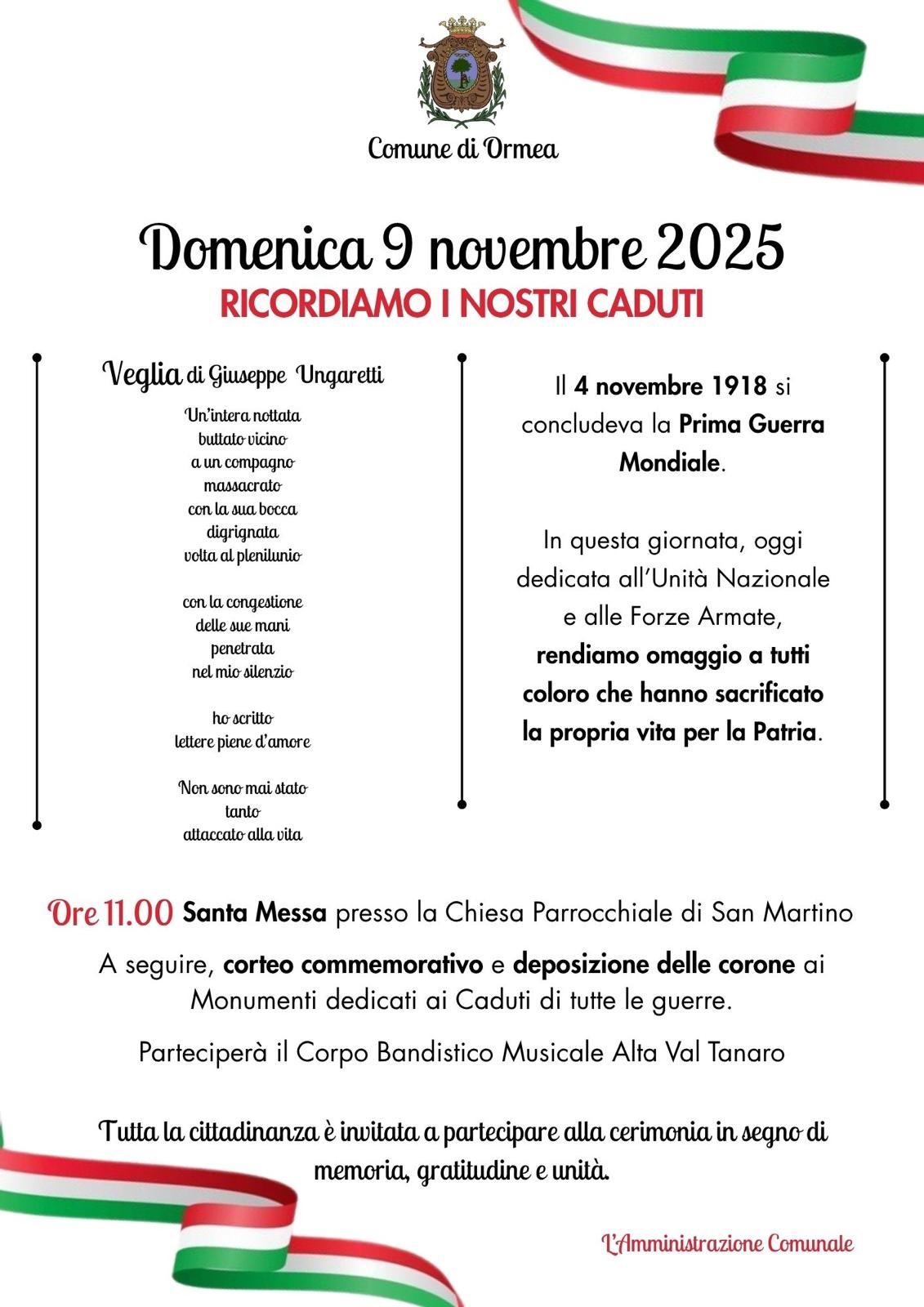Il Comune di Ormea invita tutta la cittadinanza a partecipare alla cerimonia commemorativa dedicata ai Caduti di tutte le guerre, in segno di memoria, gratitudine e unità.
