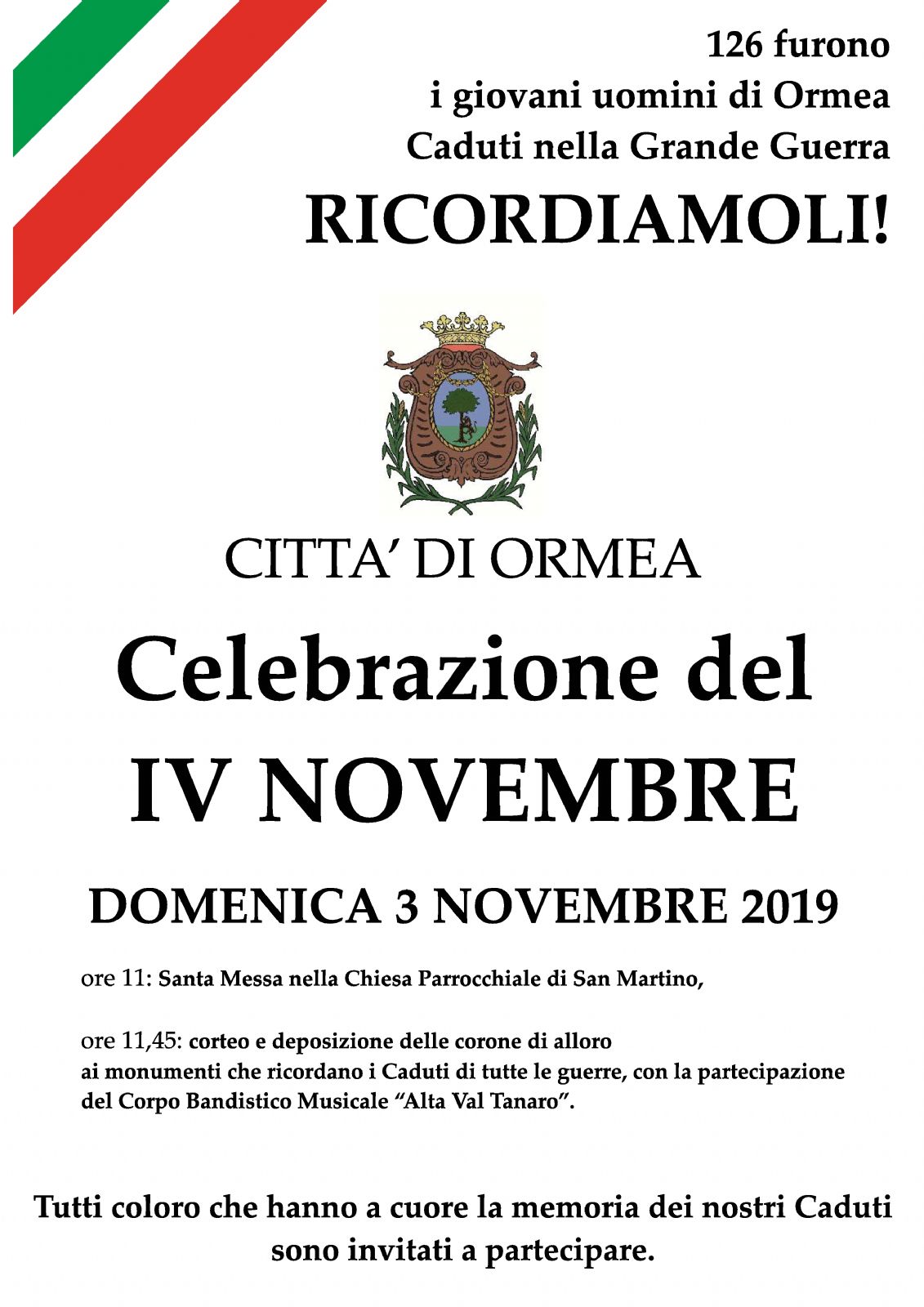 Seguirà il corteo e la deposizione delle corone ai tre monumenti che ricordano i nostri Caduti, con la partecipazione della Banda Musicale Alta Val Tanaro.
