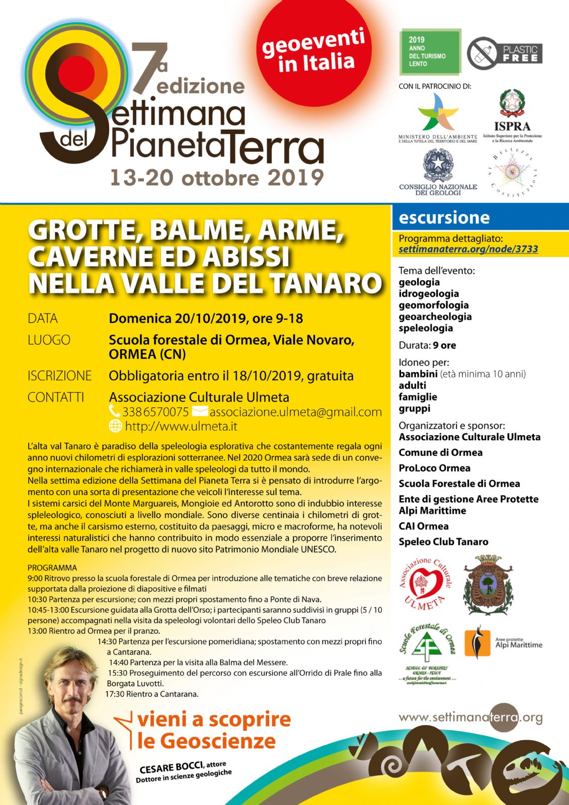 In occasione della “7a Settimana del Pianeta Terra ”l'Associazione Culturale Ulmeta", con il Comune di Ormea, la Scuola forestale di Ormea, la Condotta Slow Food Monregalese, Cebano, Alta Valle Tanaro e Pesio, l'Ente di gestione Aree protette delle Alpi Marittime, la sezione CAI di Ormea e lo Speleo Club Tanaro propone una serie di eventi con finalità ludico scientifiche sulla riscoperta del territorio e della conformazione del sottosuolo delle nostre zone.