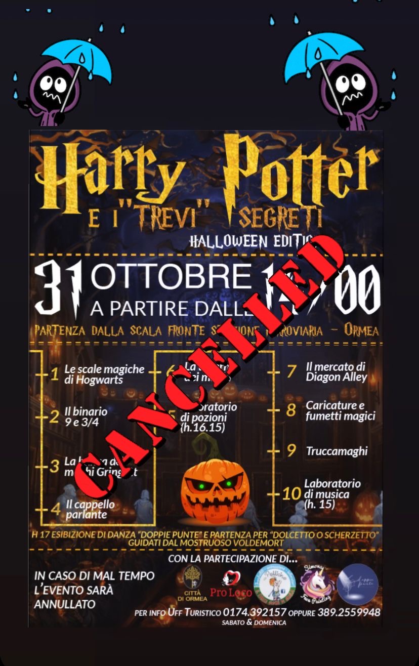 Amici maghetti, con grande rammarico, la nostra danza del ☀️ pare non aver funzionato e così siamo costretti ad annullare l’evento di domani. “Harry Potter e i «trevi» segreti” verrà mantenuto in questa formula (con qualche novità in più 🕵🏻♀️) per tempi migliori, presumibilmente in primavera quando il clima più mite e il tempo più bello ci permetterà di goderci al meglio la giornata. Sicuri della vostra comprensione, vi auguriamo comunque un buon fine settimana a voi e ai vostri piccoli mostriciattoli 🧟♂️. Restate aggiornati perché ci saranno altre novità..............🥰 Rimane confermata la proiezione del film “Harry Potter e la camera dei segreti” domani sera alle ore 20,30 al nuovo cinema Ormea. Accorrete perché all’ingresso ad accogliervi ci sarà qualcuno di vostra conoscenza......🧙🏻♂️ In caso la pioggia ce lo consenta e non ci sia il diluvio, alle 16,30 ci troveremo in piazza San Martino per “dolcetto o scherzetto”. Ma anche in questo caso in fase di aggiornamento fino all’ultimo 🤞🏻