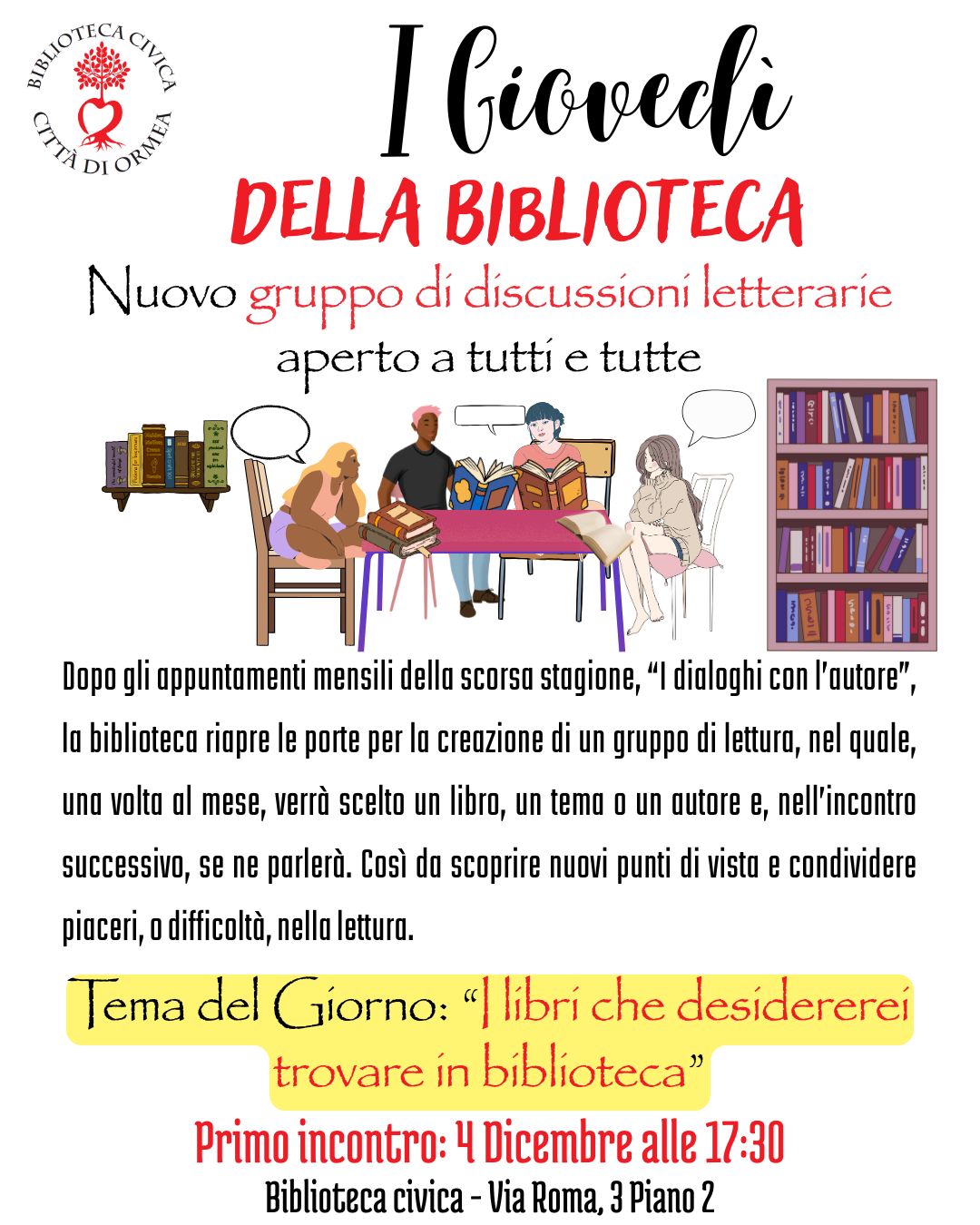 Giovedì 4 dicembre alle ore 17.30, presso la Biblioteca Civica in Via Roma 3, al secondo piano, ricominciano i Giovedì della Biblioteca.