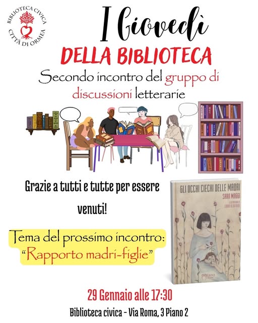 Giovedì 29 gennaio dalle ore 17.30, presso la Biblioteca Civica di Ormea, si svolgerà il secondo incontro de "I Giovedì della Biblioteca", il tema scelto per l'occasione è il Rapporto Madri-Figlie.