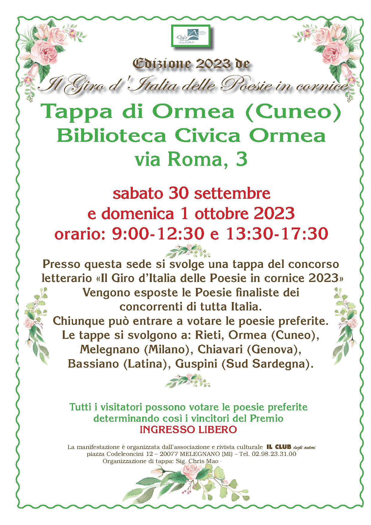 Presso la Biblioteca Civica di Ormea dalle ore 9.00 alle 12.30 e dalle 13.30 alle 17.30 si svolge una tappa del concorso letterario 'Il Giro d'Italia delle Poesie in cornice 2023'. Vengono esposte le Poesie finaliste dei concorrenti di tutta Italia. Chiunque può votare le poesie preferite.