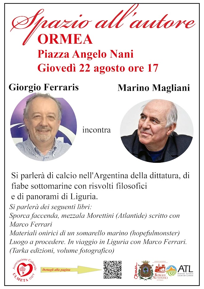 Giorgio Ferraris incontra Marino Magliani. Si parlerà di calcio nell'Argentina della dittatura, di fiabe sottomarine con risvolti filosofici e di panorami di Liguria.