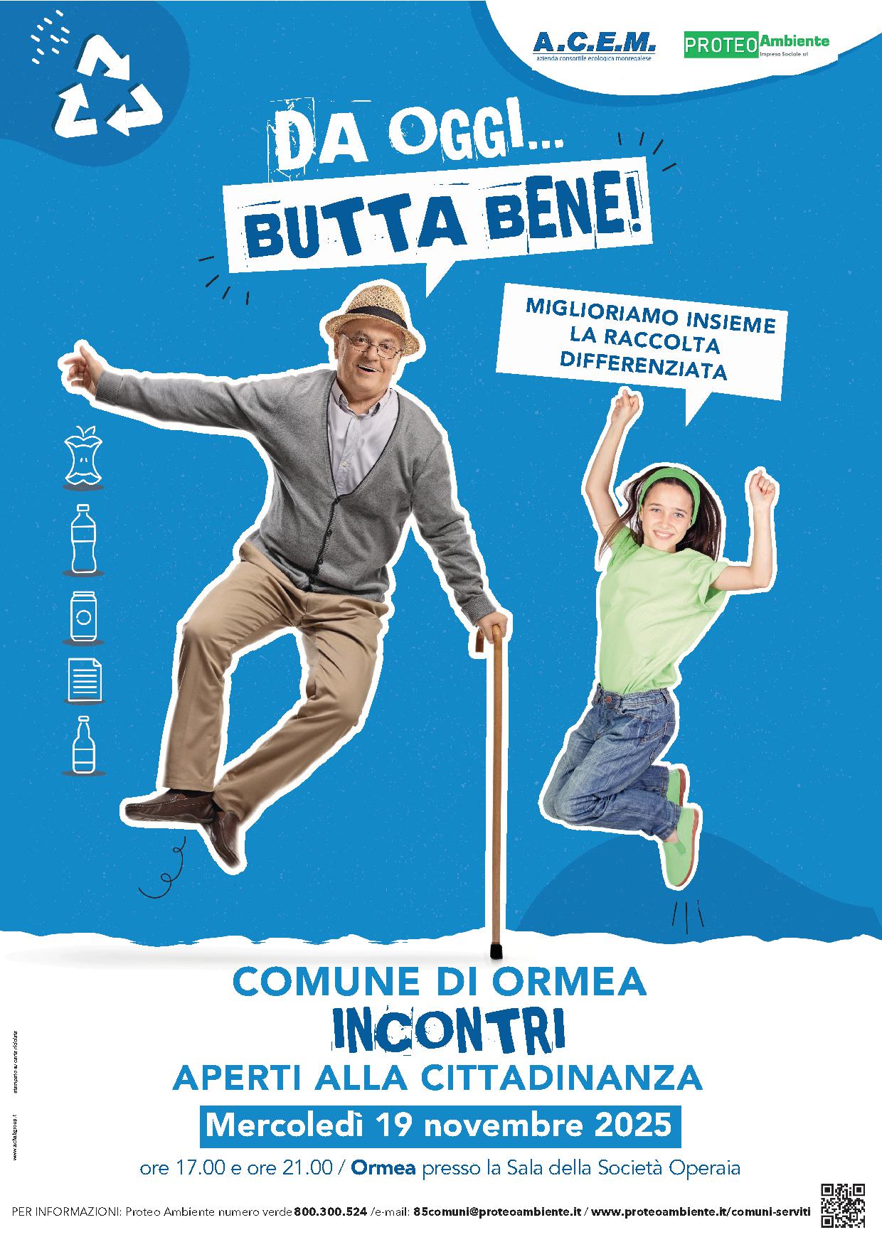 Il Comune di Ormea, in collaborazione con A.C.E.M. e Proteo Ambiente, invita tutta la cittadinanza a partecipare agli incontri pubblici dedicati al nuovo metodo di raccolta dei rifiuti.