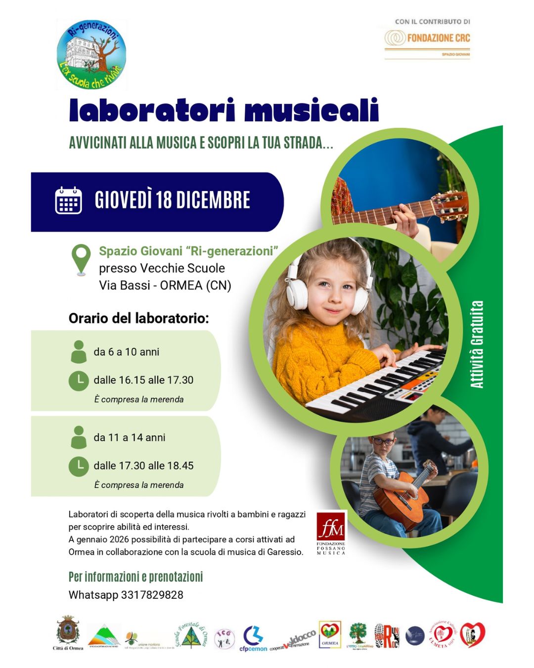 Ti aspettiamo giovedì 18 dicembre presso lo Spazio Giovani in Via Bassi, 31 Ormea per un laboratorio musicale per scoprire abilità ed interessi!