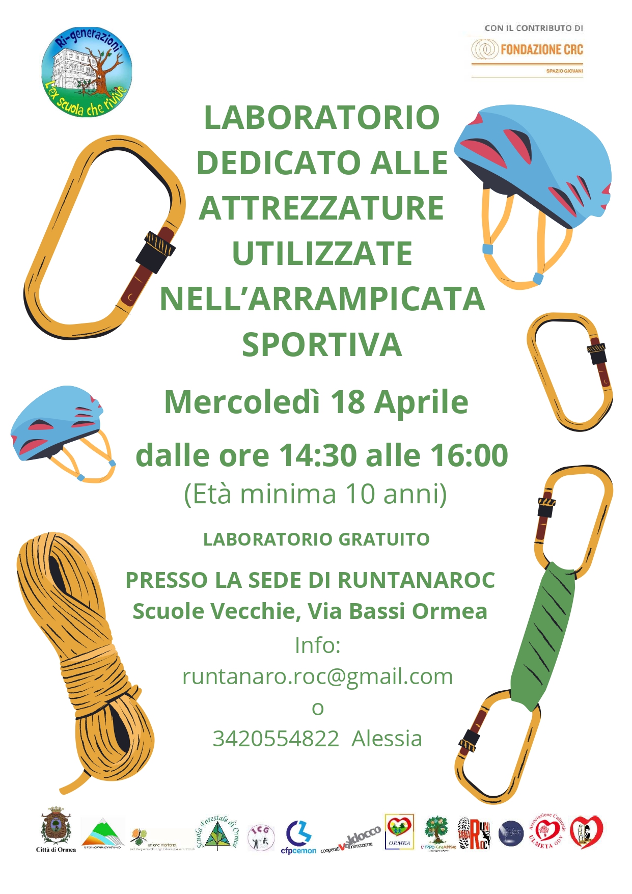 Mercoledì 18 aprile 2026 i ragazzi dell'Associazione RunTanaRoc vi aspettano per imparare a conoscere le attrezzature utilizzate nell'arrampicata sportiva presso Via Bassi, 31 - Ormea