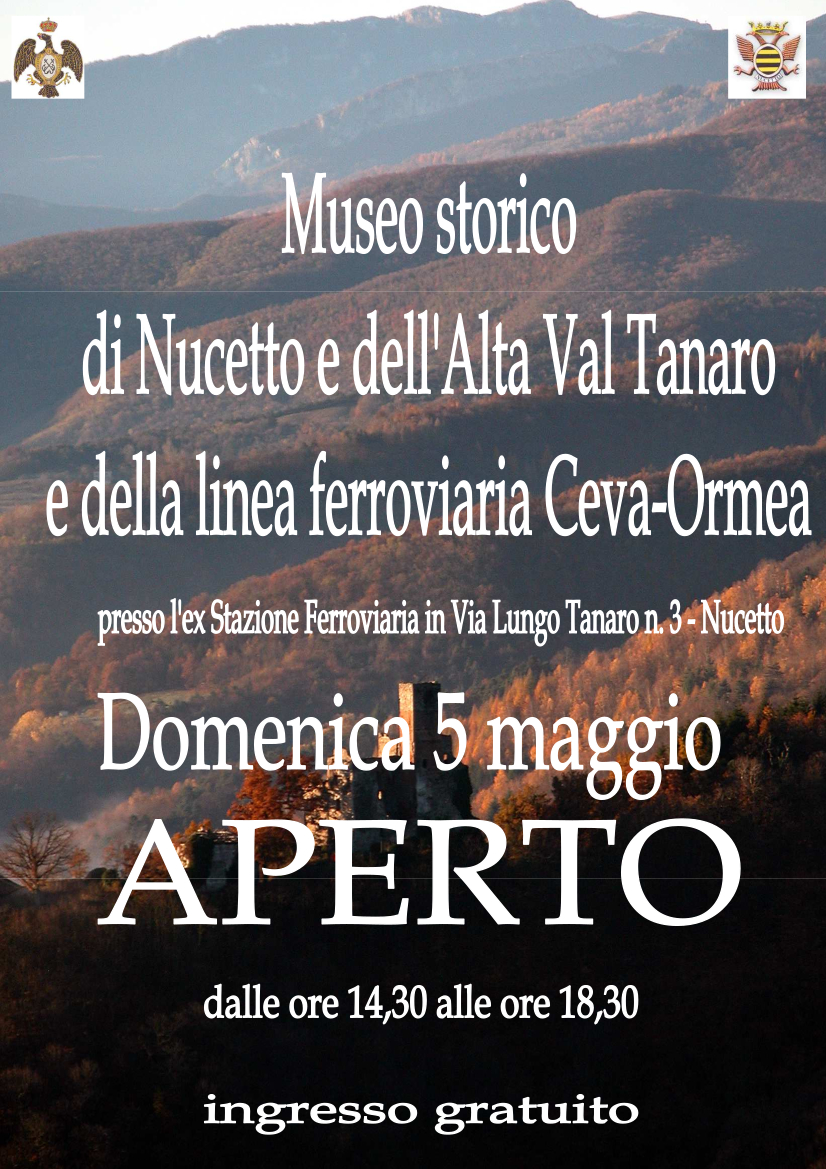 Le sale del Museo storico di Nucetto e dell'Alta Val Tanaro e del Museo della linea ferroviaria Ceva-Ormea saranno aperti al pubblico dalle ore 14,30 alle ore 18,30 con ingresso libero.