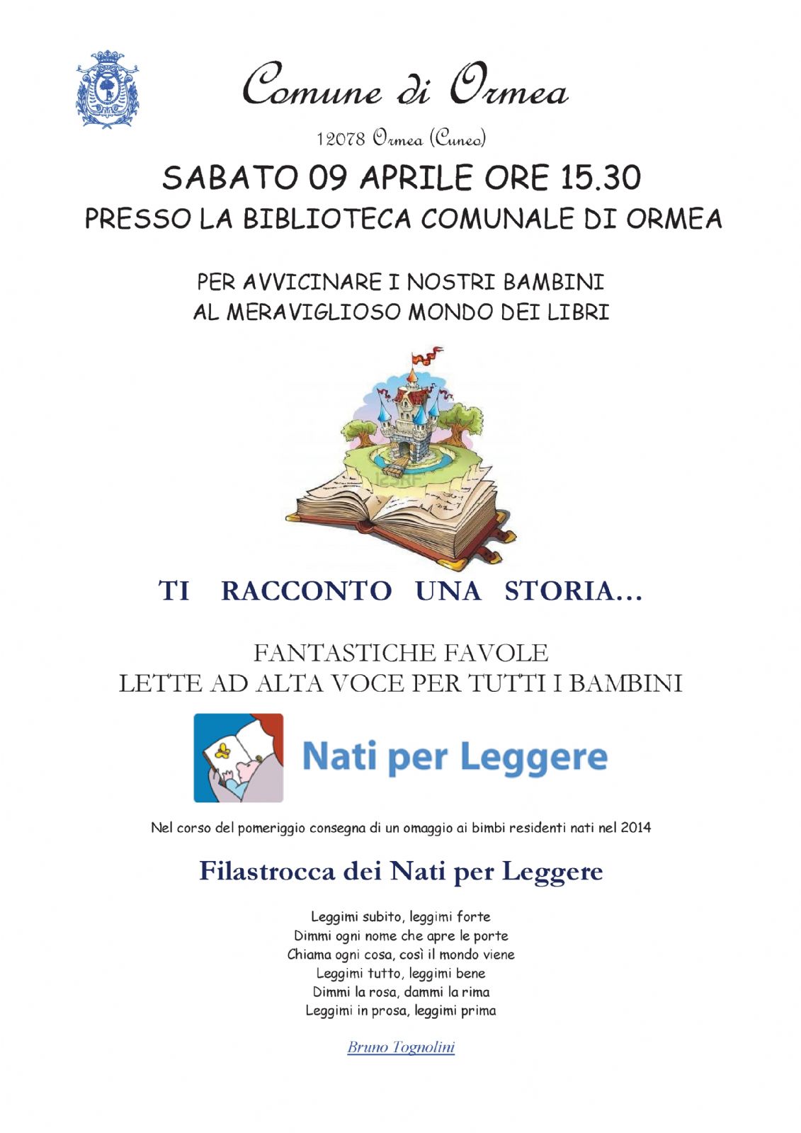 Sabato 09 aprile ore 15.30 incontro presso la biblioteca comunale di Ormea per avvicinare i nostri bambini al meraviglioso mondo dei libri.