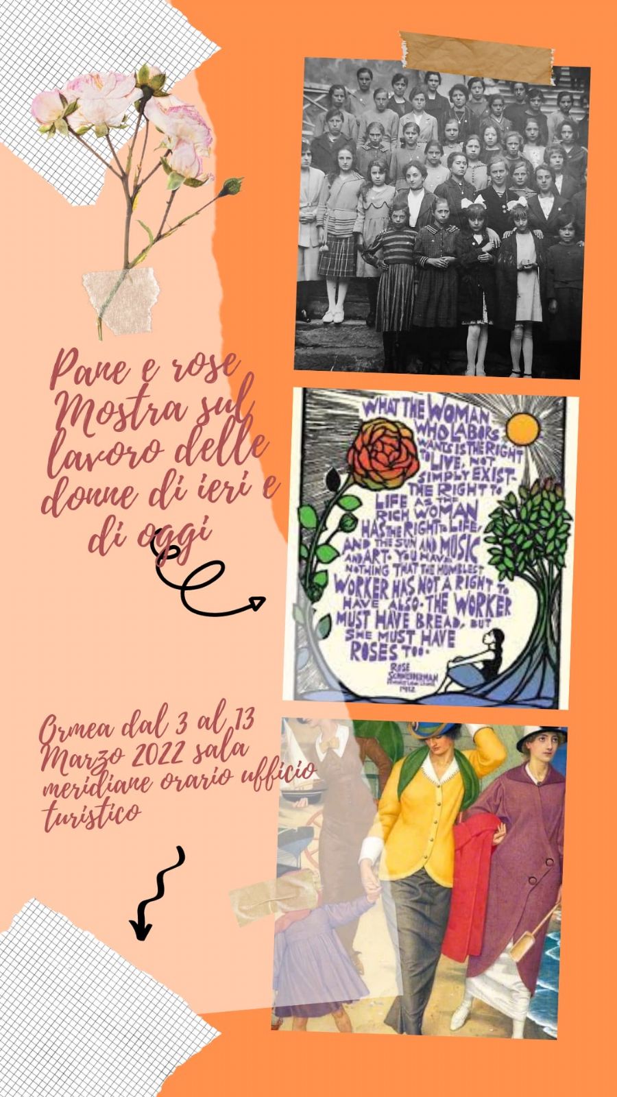 Pane e rose è una mostra tutta al femminile che le ragazze di Ormea dedicano al lavoro delle donne di Ieri e di oggi. Bread and roses è un omaggio e un pensiero di sorellanza alle donne che nel 1912 a Lawrence, America, diedero il via a un famosissimo sciopero delle lavoratrici dell'industria tessile che chiedevano una riduzione dell'orario di lavoro e un miglioramento delle condizioni di vita. Non solo aumento salariale ma la possibilità di godere delle cose buone e belle della vita. L'allestimento della mostra sarà un omaggio alle donne di Ormea che con il loro lavoro hanno contribuito e contribuiscono al benessere della collettività.