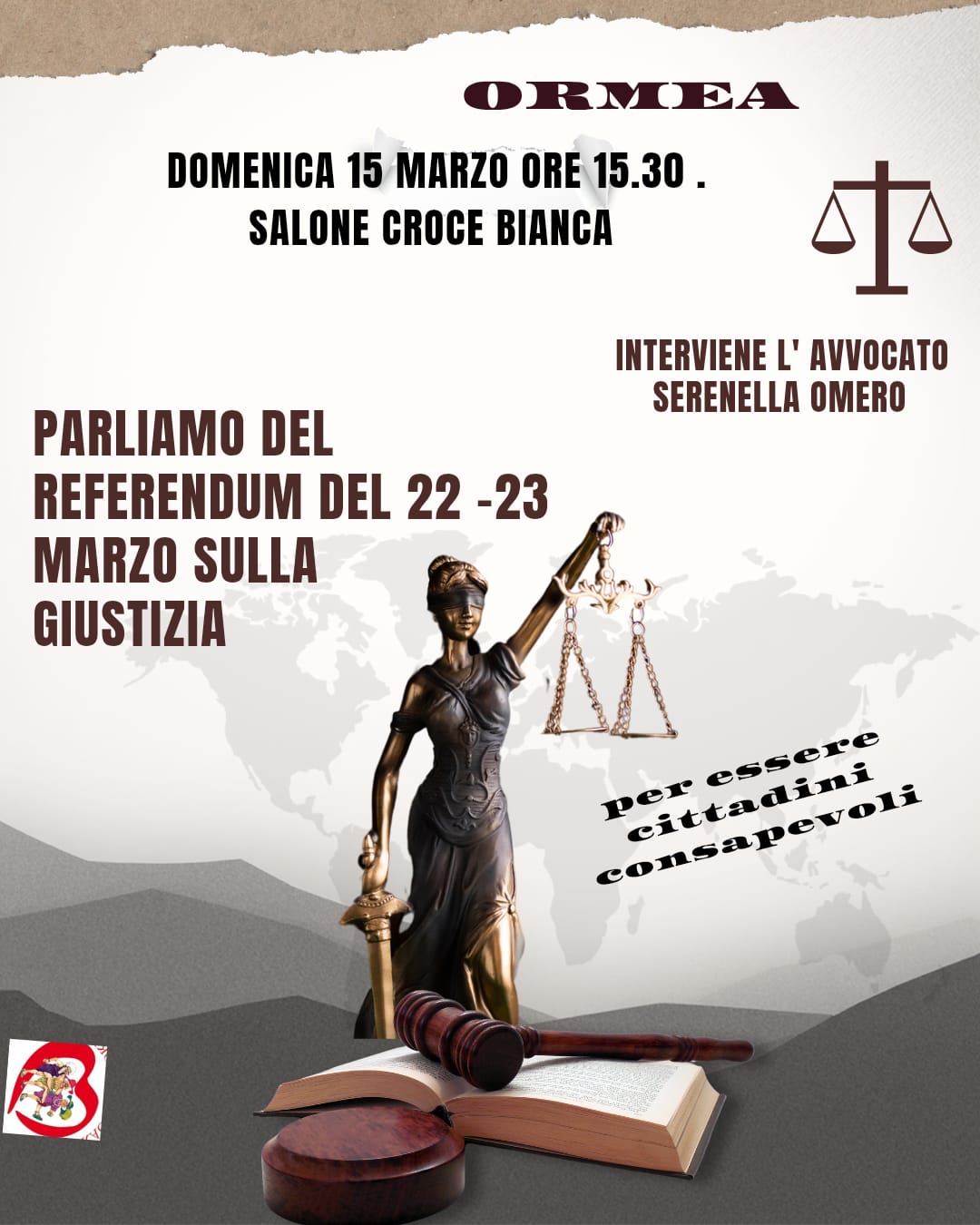 Domenica 15 marzo dalle ore 15.30 presso la Sala della Croce Bianca, si svolgerà l'incontro con l'avvocato Serenella Omero riguardante il prossimo Referendum del 22-23 marzo.