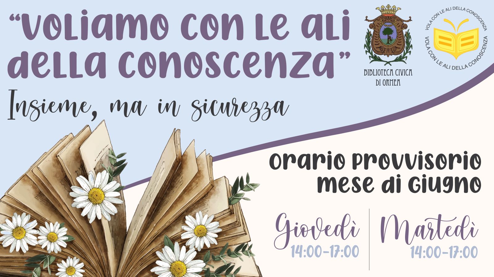 Si comunica che a partire da martedì 8 giugno 2021 la Biblioteca civica di Ormea riaprirà al pubblico con un orario provvisorio per il mese di giugno: