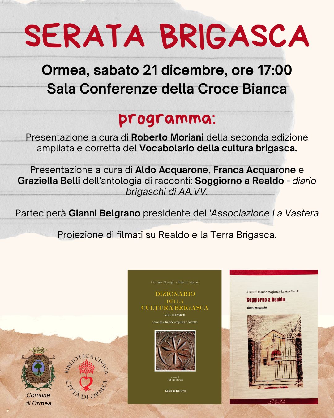 Sabato 21 dicembre alle ore 17, vi invitiamo a un evento speciale: la Serata Brigasca nella Sala Conferenza della Croce Bianca di Ormea!