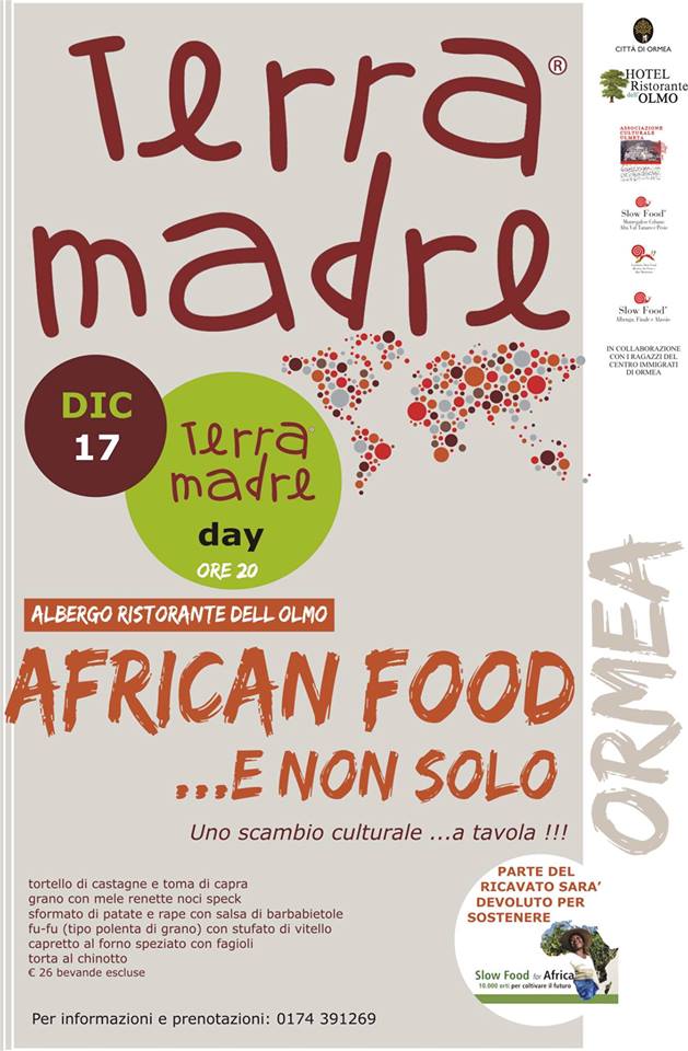 La manifestazione, in collaborazione con Slow Food Monregalese è stata pensata dai “Ragazzi” del Centro Immigrati di Ormea per fare un altro passo verso l’integrazione. La cena si svolgerà presso l'Albergo dell'Olmo con l’aiuto e la supervisione degli Operatori del centro e dello staff del Ristorante, dove verrà preparato un menù con diverse portate: piatti Africani e piatti locali rivisitati. Per far sposare i due tipi di cucina verranno utilizzati i prodotti del territorio, con la collaborazione dei Produttori dell' Alta Valle Tanaro. Nella giornata della manifestazione Terra Madre oltre ad abbracciare altre culture culinarie, si vuole sottolineare l’importanza della filiera corta in ottica di Valle e di territorio in generale dato un sensibile ritorno alle campagne e all’agricoltura, e in oltre potrebbe essere uno sbocco per nuove possibilità di integrazione e lavoro per tutti. Parte del ricavato della serata sarà devoluto a sostegno del progetto 10000 Orti in Africa