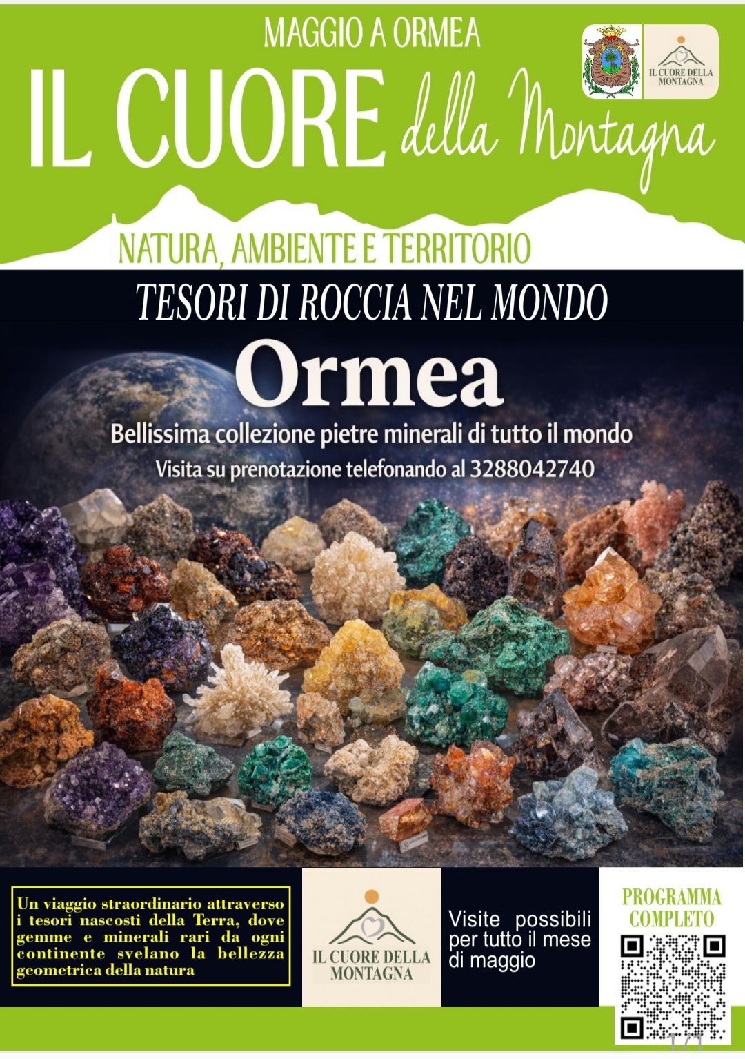Per l'intero mese di maggio, in occasione de 'Il Cuore della Montagna" sarà presente una mostra di minerali provenienti da tutto il mondo, tra forme e colori sorprendenti, situata in Viale G.S Cagna n.31.