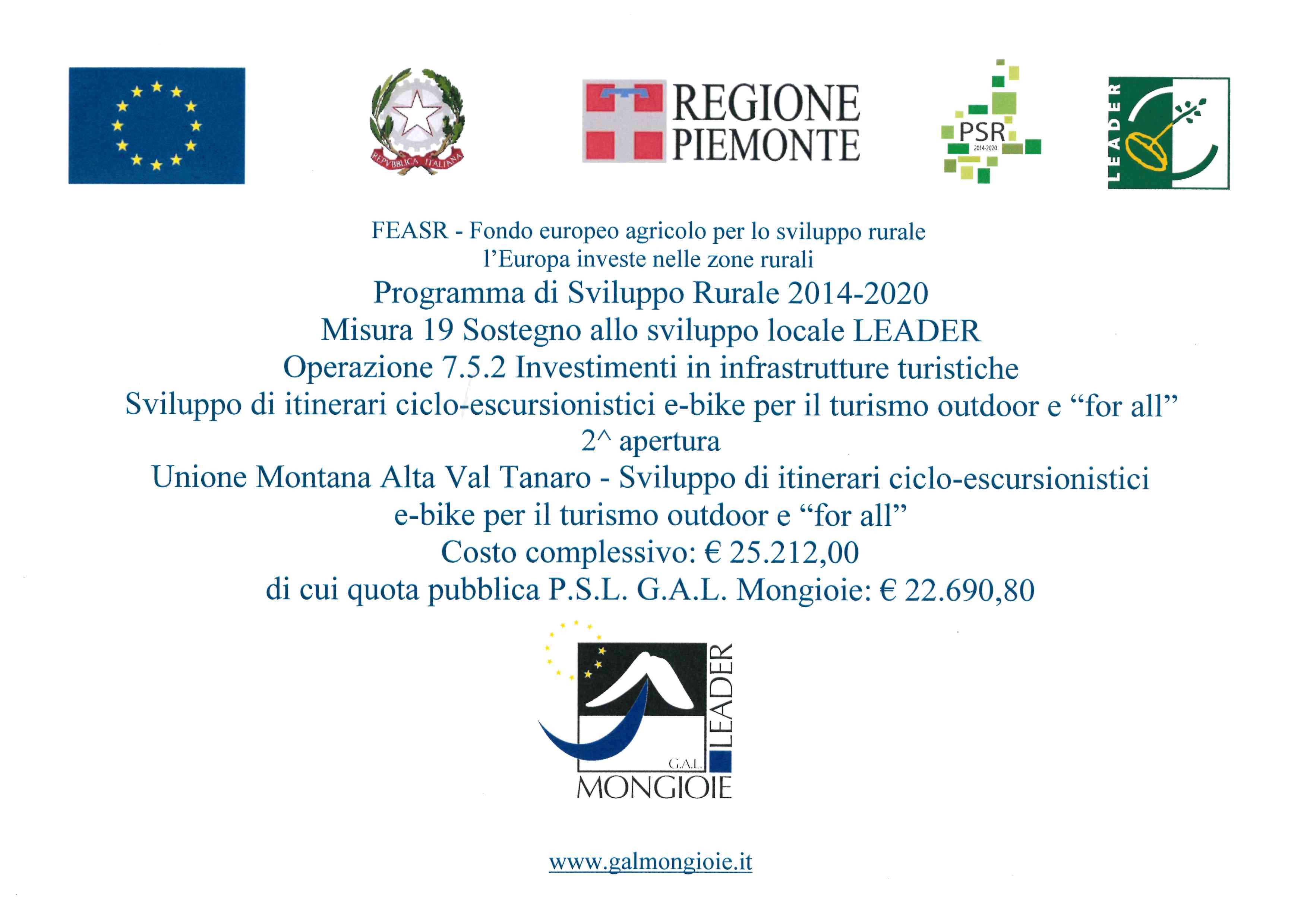 L'Unione Montana Alta Val Tanaro è beneficiaria del Fondo Europeo Agricolo per lo Sviluppo Rurale (FEASR) attraverso il Programma di Sviluppo Rurale 2014-2020 del GAL Mongioie, per l'attuazione della Misura 19 LEADER del PSR, che ha come obiettivo principale lo sviluppo sostenibile delle zone rurali e mira al rafforzamento del legame esistente tra agricoltura di montagna e ambiente, tra turismo e sviluppo delle aree ruralità.