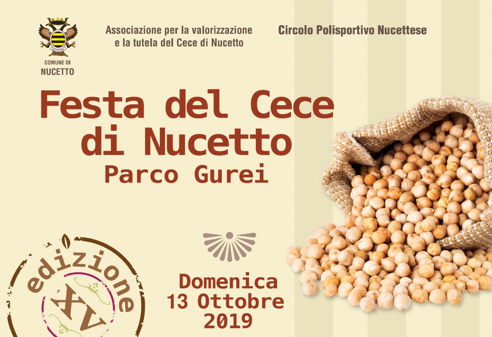 Domenica 13 ottobre si svolgerà la XV edizione della "Festa del Cece di Nucetto" organizzata dal Comune in collaborazione con l'Associazione per la Tutela e la Valorizzazione del Cece di Nucetto e il Circolo Polisportivo Nucettese.