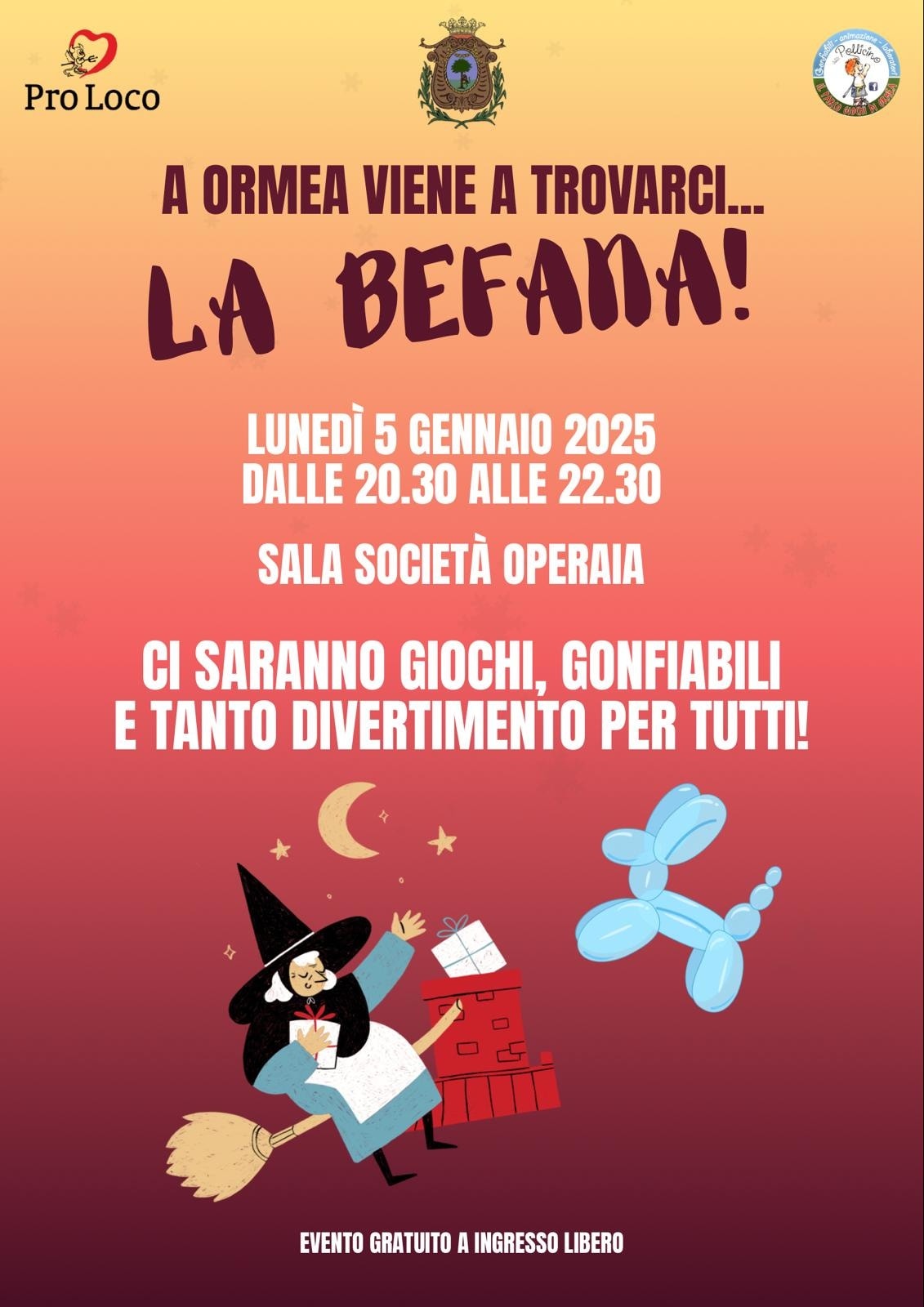 Lunedì 5 gennaio farà tappa a Ormea la Befana, presso la Sala della Società Operaia, a partire dalle ore 20.30 alle 22.30, con giochi, gonfiabili e divertimento per grandi e piccini.