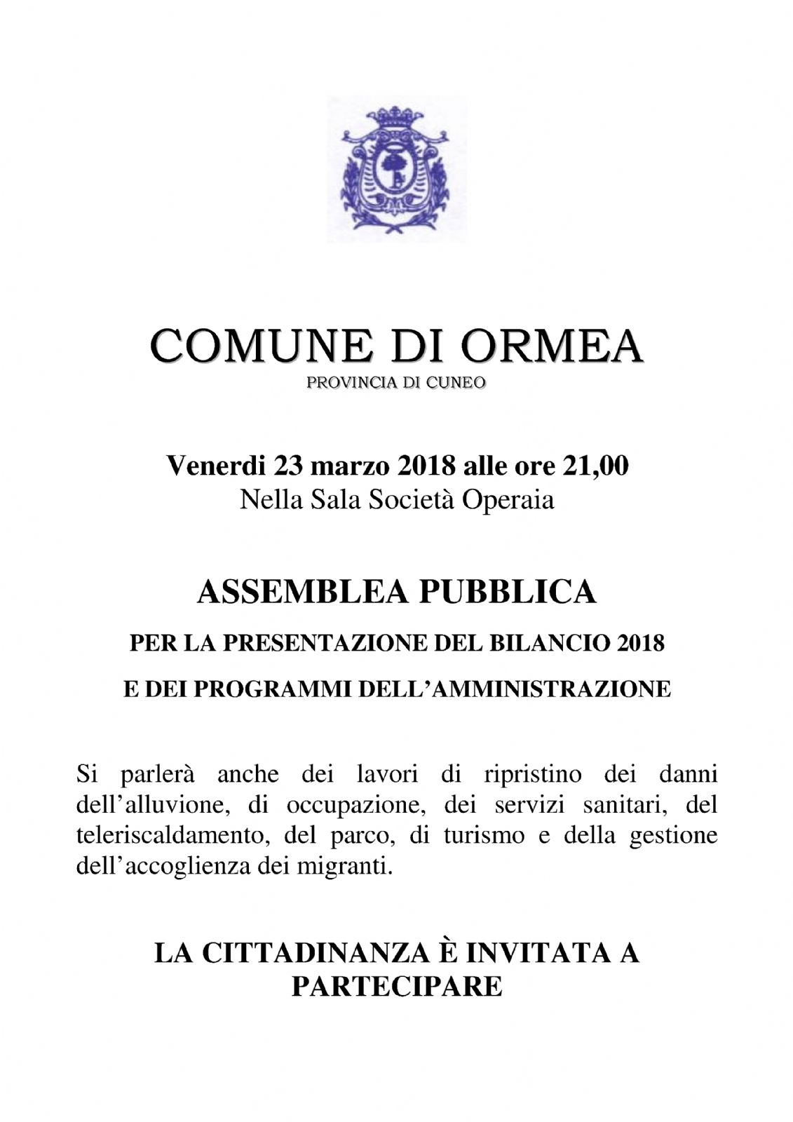 Venerdì 23 marzo 2018 alle ore 21 nella Sala Societa’ Operaia si terra’ l’assemblea pubblica sul bilancio 2018 del Comune di Ormea.