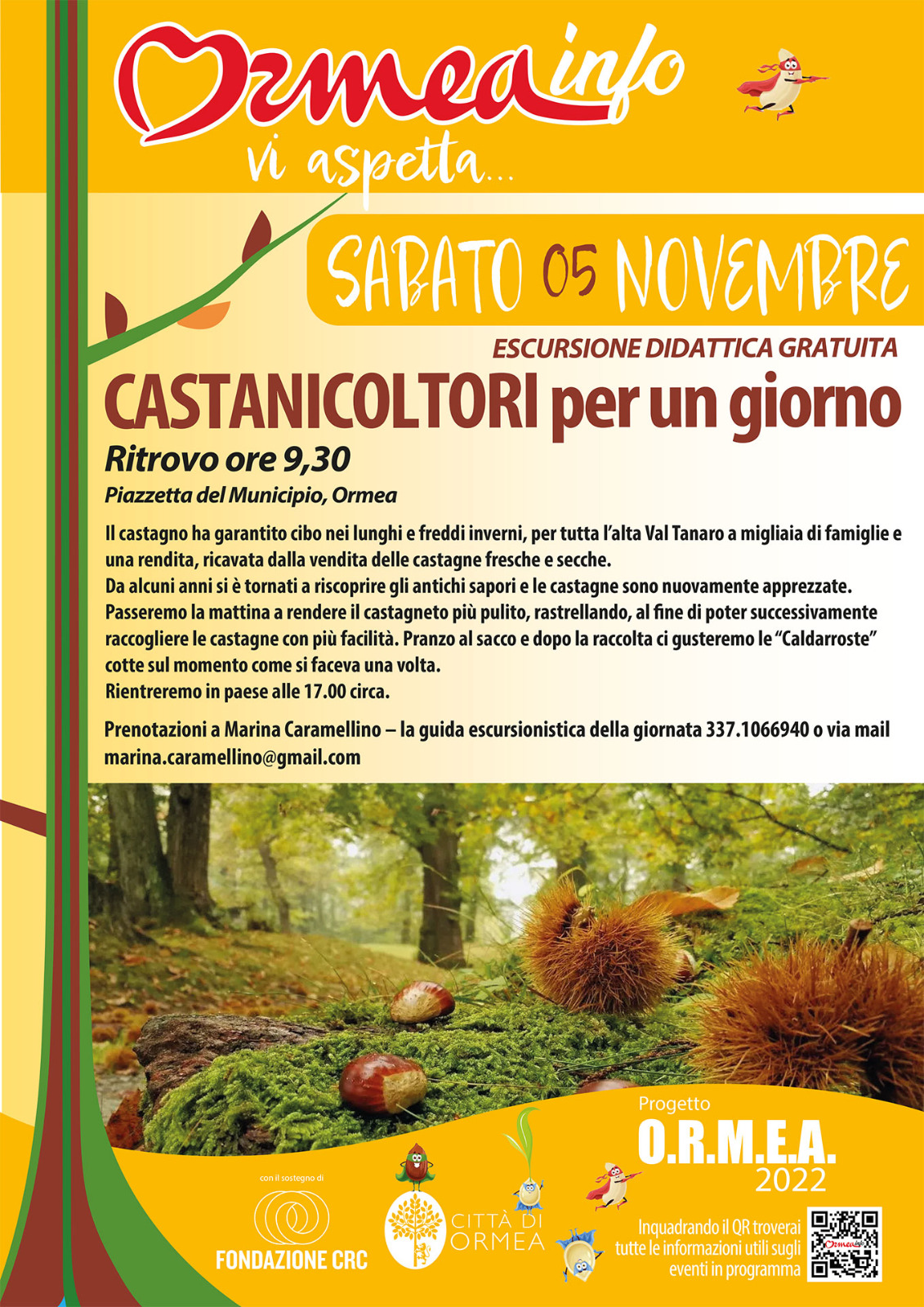 Da alcuni anni si è tornati a riscoprire gli antichi sapori e le castagne sono nuovamente apprezzate. Passeremo la mattinata a rendere il castagneto più pulito, rastrellando, al fine di poter successivamente raccogliere le castagne con più facilità. Pranzo al sacco e dopo la raccolta ci gusteremo le "Caldarroste" cotte sul momento come si faceva una volta. Rientreremo in paese alle 17.00 circa.