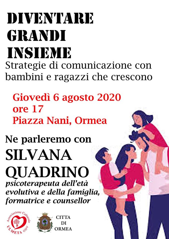 Associazione Ulmeta presenta "Diventare grandi insieme - strategie di comunicazione con bambini e ragazzi che crescono". Se ne parlerà con Silvana Quadrino, psicoterapeuta dell'età evolutiva e della famiglia, formatrice e counsellor.