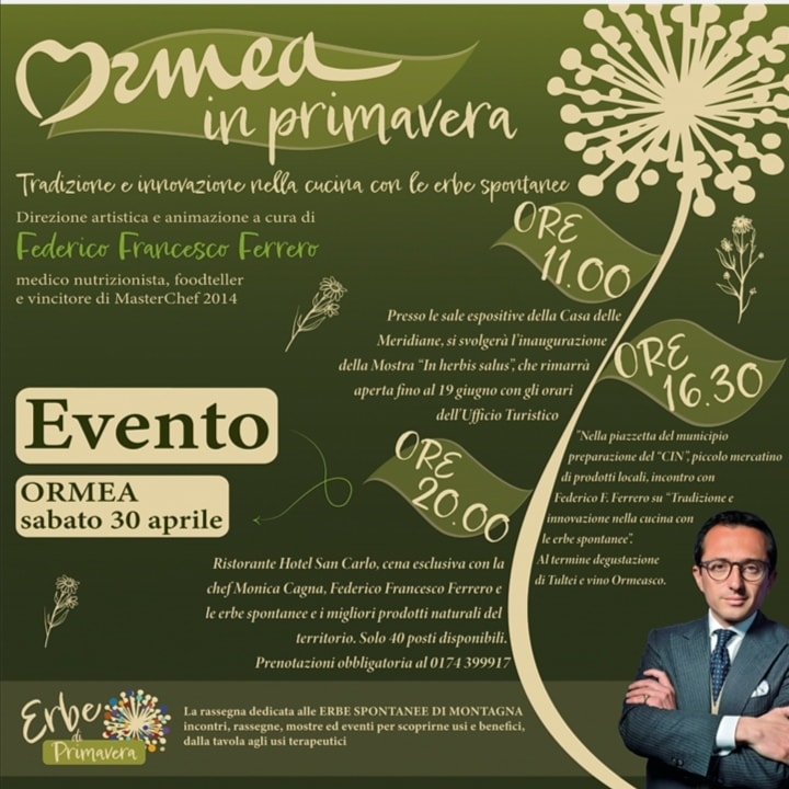 ore 20.00 Presso il Ristorante Hotel San Carlo, cena esclusiva a base di erbe spontanee e prodotti naturali del territorio. Solo 40 posti disponibili. Prenotazione obbligatoria: 0174 399 917