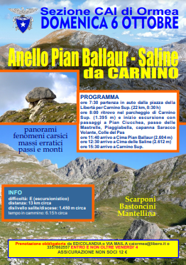 Si richiede abbigliamento adeguato (Scarponi, bastoncini, mantellina)