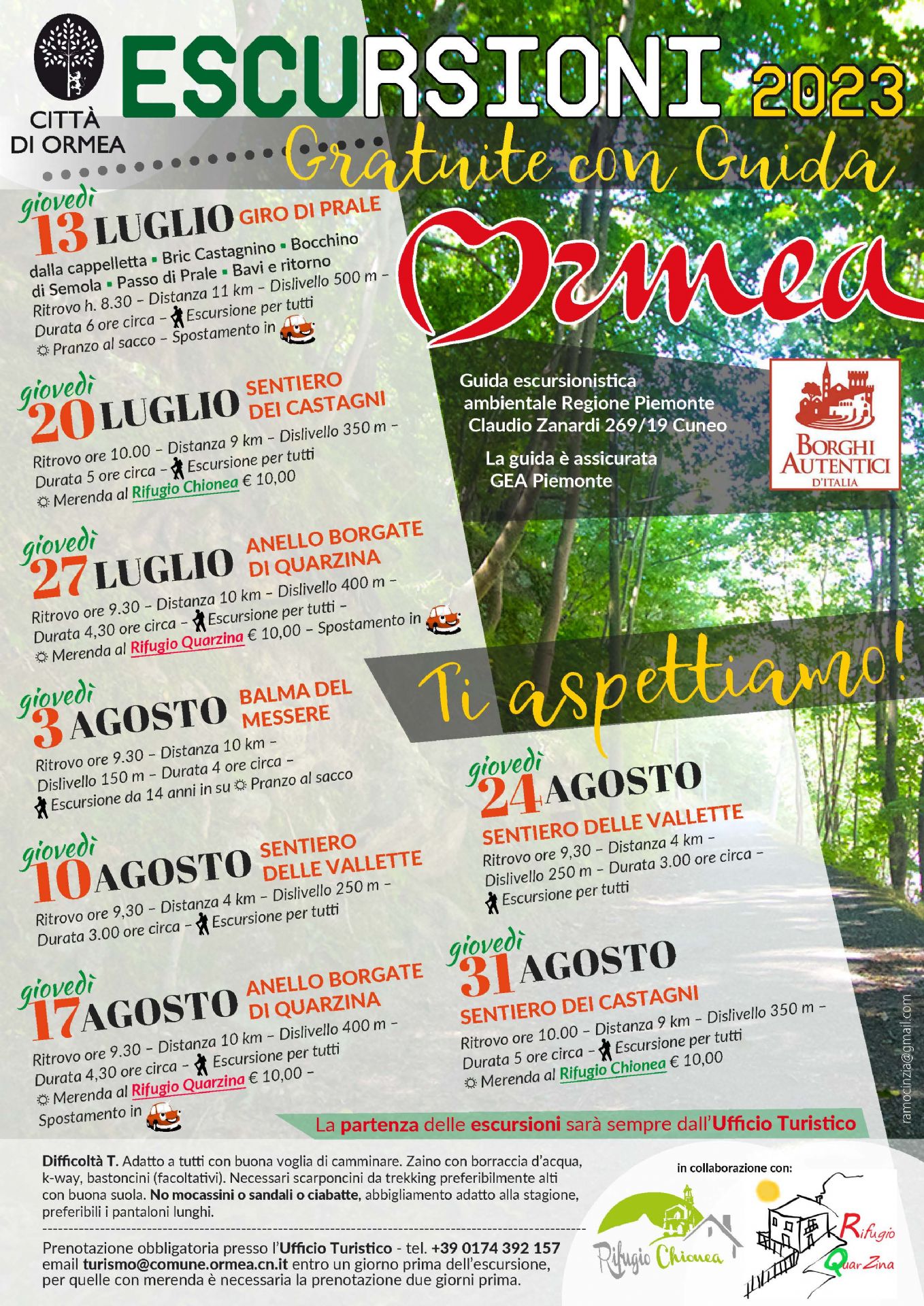 email turismo@comune.ormea.cn.it entro un giorno prima dell'escursione, per quelle con merenda è necessaria la prenotazione due giorni prima.