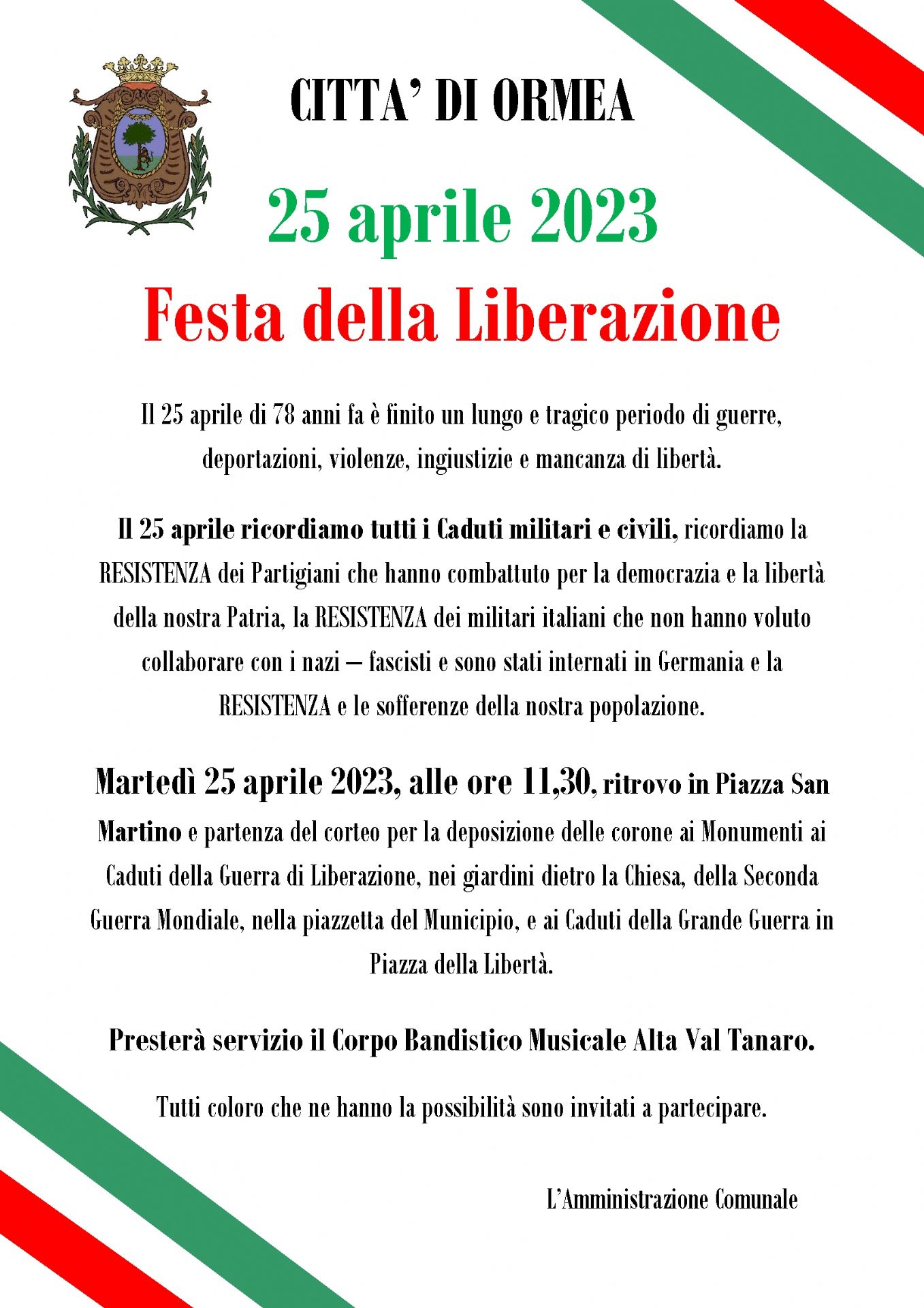 Martedì 25 aprile 2023, alle ore 11,30, ritrovo in Piazza San Martino e partenza del corteo per la deposizione delle corone ai Monumenti ai Caduti della Guerra di Liberazione, nei giardini dietro la Chiesa, della Seconda Guerra Mondiale, nella piazzetta del Municipio, e ai Caduti della Grande Guerra in Piazza della Libertà.