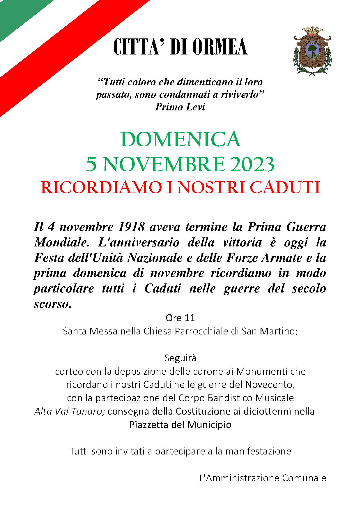 Il 4 novembre 1918 aveva termine la Prima Guerra Mondiale. L'anniversario della vittoria è oggi la Festa dell'Unità Nazionale e delle Forze Armate e la prima domenica di novembre ricordiamo in modo particolare tutti i Caduti nelle guerre del secolo scorso.