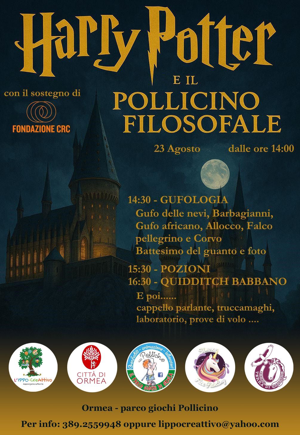 E per tutto il pomeriggio, cappello parlante, truccamaghi, laboratori e prove di volo per un’avventura indimenticabile.