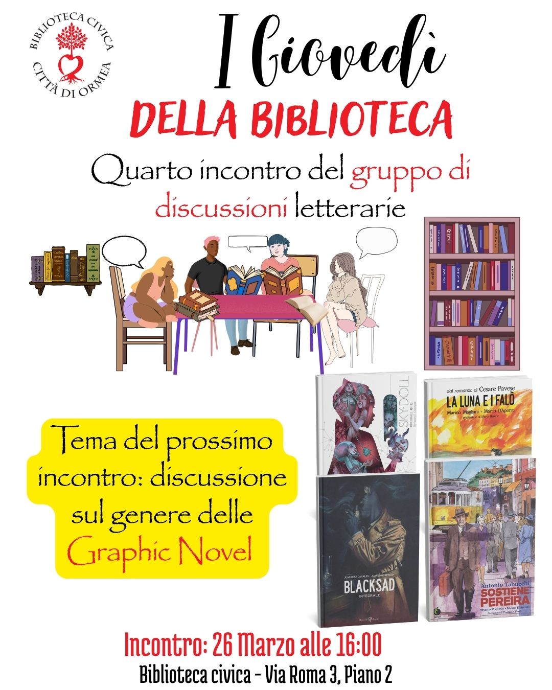 Giovedì 26 marzo, dalle ore 16 presso la Biblioteca Civica di Ormea, seguirà il quarto incontro del gruppo di discussioni letterarie.