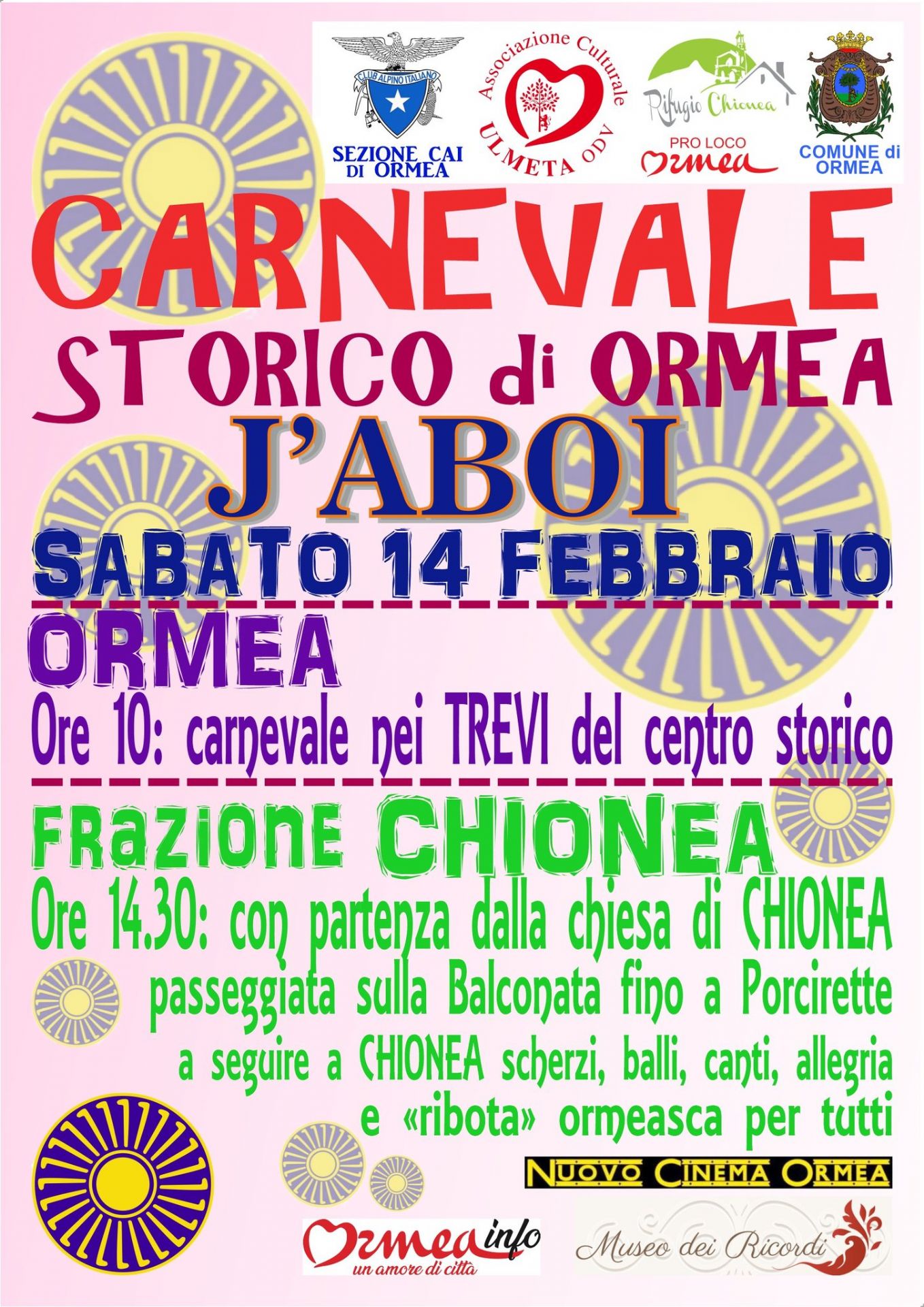 Alle ore 14.30, in frazione Chionea, con partenza dalla Chiesa di Chionea passeggiata sulla Balconata fino a Porcirette a seguire a Chionea scherzi, balli, canti, allegria e "ribota" ormeasca per tutti.