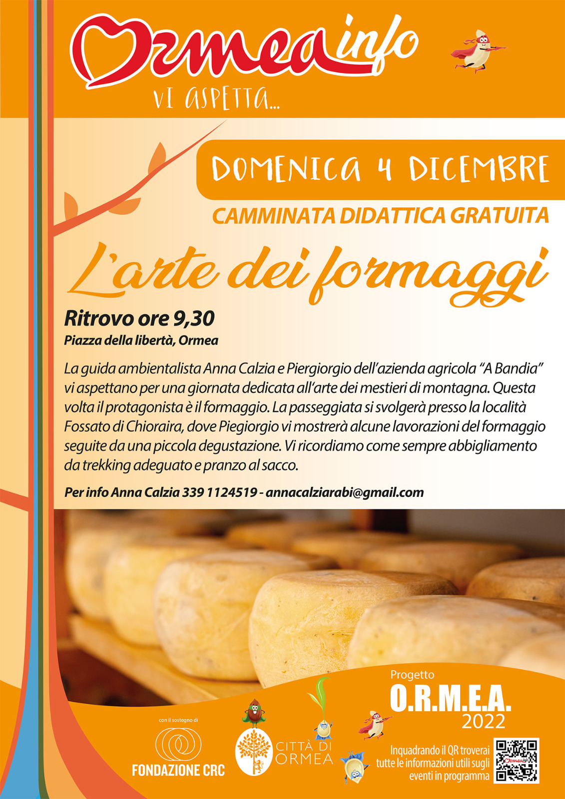 La guida ambientalistica Anna Calzia e Piergiorgio dell'Azienda Agricola "A Bandia" vi aspettano per una giornata dedicata all'arte dei mestieri di montagna. Questa volta il protagonista è il formaggio. La passeggiata si svolgerà presso la località Fossato di Chioraira, dove Piergiorgio vi mostrerà alcune lavorazioni del formaggio seguite da una piccola degustazione. Vi ricordiamo come sempre abbigliamento da trekking adeguato alla stagione e pranzo al sacco.