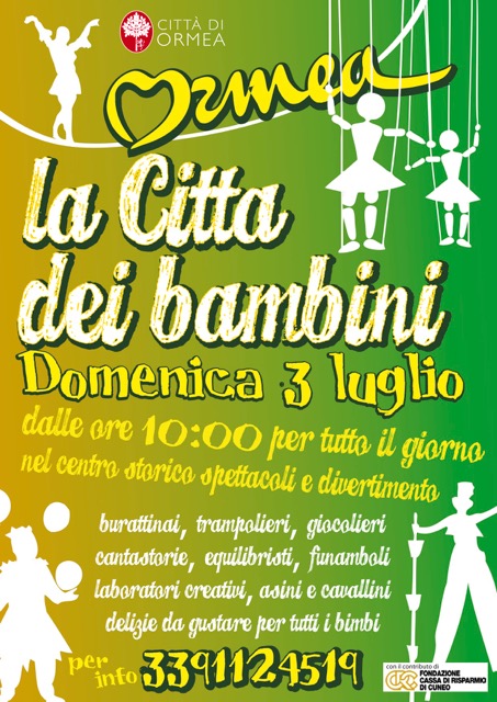 dalle ore 10:00 per tutto il giorno nel centro storico di Ormea spettacoli e divertimento per i più piccoli con burattinai, trampolieri, giocolieri, cantastorie, equilibristi, funamboli, laboratori creativi, asini e cavallini e molto altro....