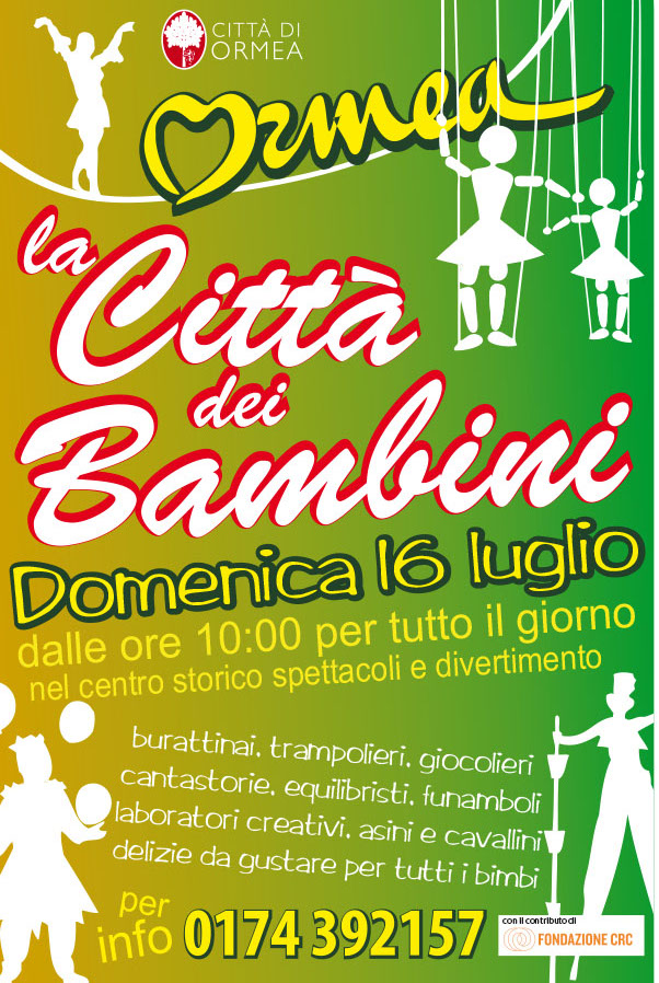 Una giornata interamente dedicata ai più piccoli, con attività e laboratori educativi e creativi, attivi dal mattino per tutto l’arco della giornata. Il centro storico di Ormea, con le sue piazze ed i suoi vicoli, si trasformerà per l’ occasione in un palcoscenico a cielo aperto ospitando truccabimbi, trampolieri, burattinai cantastorie, equilibristi e ancora laboratori creativi di danza e movimento, gonfiabili, i giochi di una volta, ed un piccolo mercatino dedicato ai ragazzi.