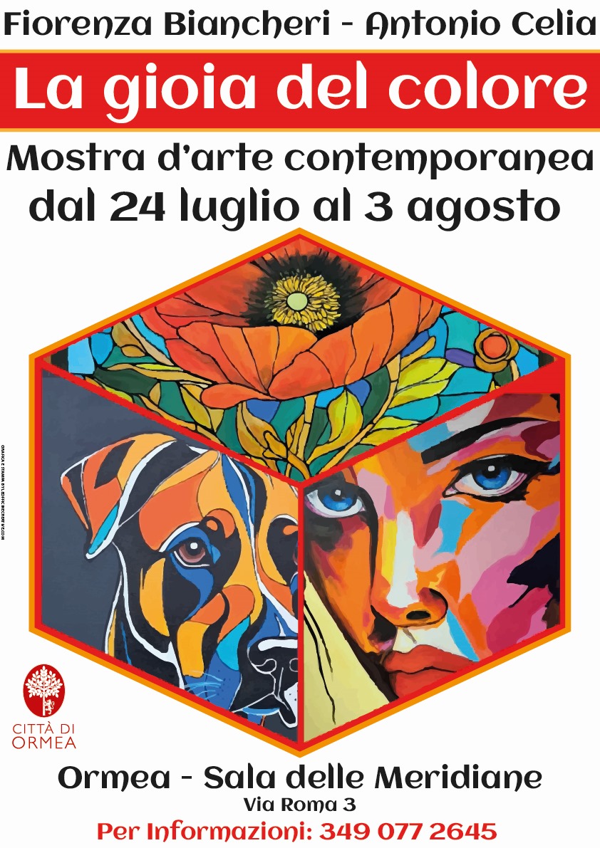 Dal 24 luglio al 3 agosto, la Sala delle Meridiane (Via Roma 3) ospita la mostra d’arte contemporanea "La gioia del colore" firmata da Fiorenza Biancheri e Antonio Celia.