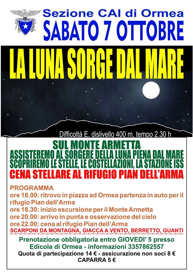 SUL MONTE ARMETTA ASSISTEREMO AL SORGERE DELLA LUNA PIENA DAL MARE SCOPRIREMO LE STELLE, LE COSTELLAZIONI, LA STAZIONE ISS CENA STELLARE AL RIFUGIO PIAN DELL’ARMA
