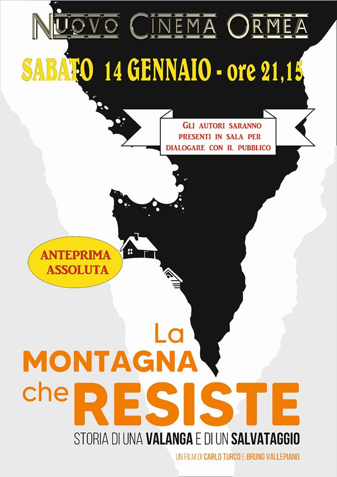 Sabato 14 gennaio alle 21,15 appuntamento al Nuovo Cinema Ormea con la PRIMA ASSOLUTA del film che racconta, attraverso la voce dei testimoni, quello che accadde a Valdarmela il 19 febbraio del 1972: la caduta di una valanga che travolse la frazione causando morte e distruzione.